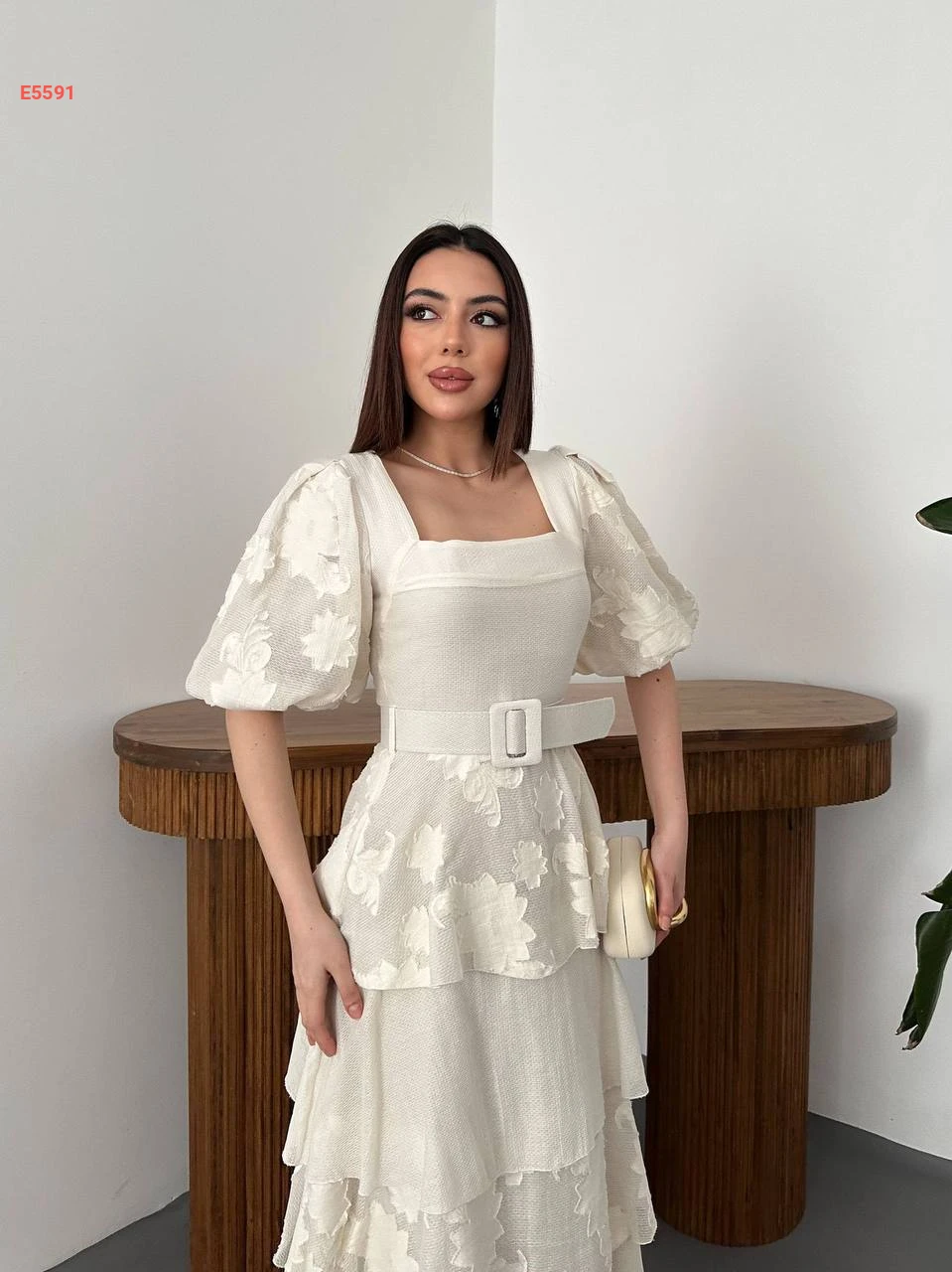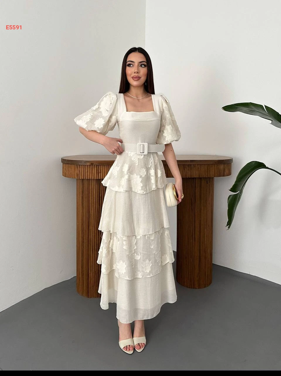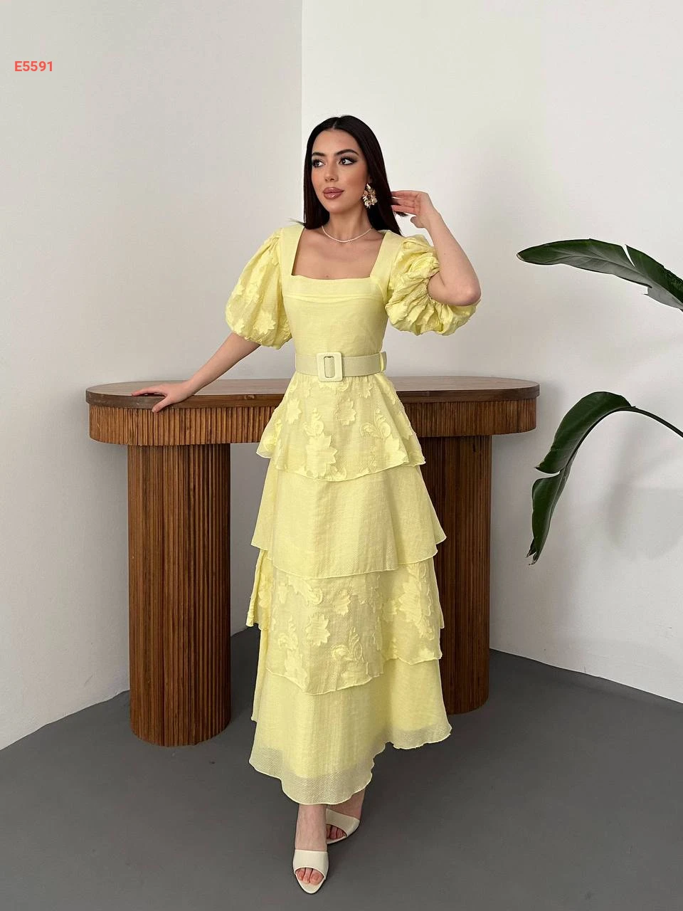 فستان طويل كشكش بأكمام نفخ قصيرة