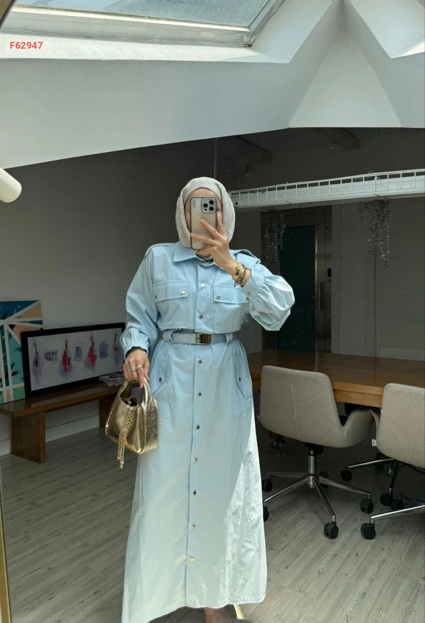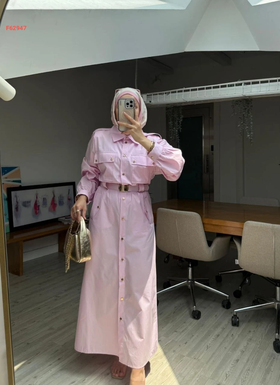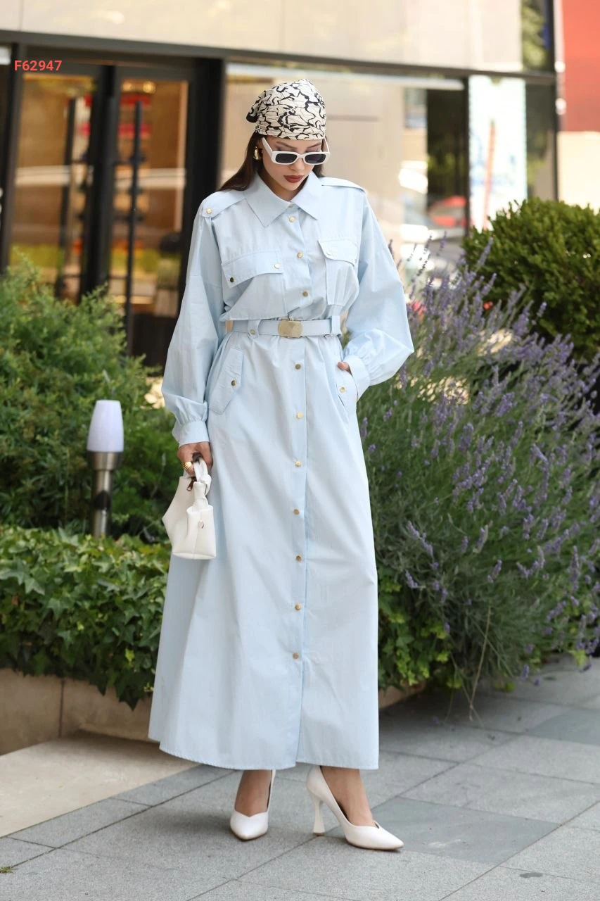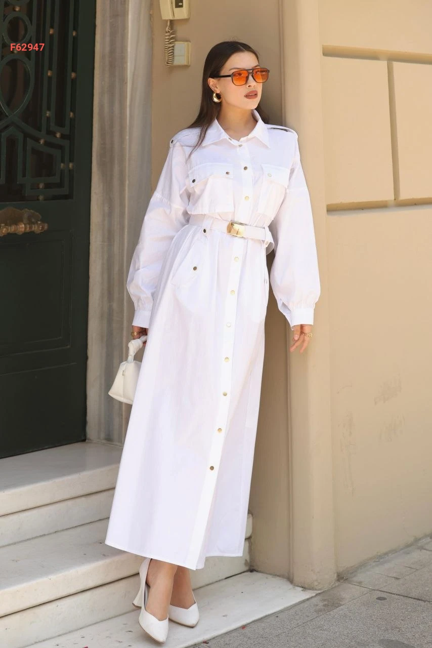 فستان طويل "سفاري" بأزرار أمامية وجيوب بارزة مع حزام خصر متناسق