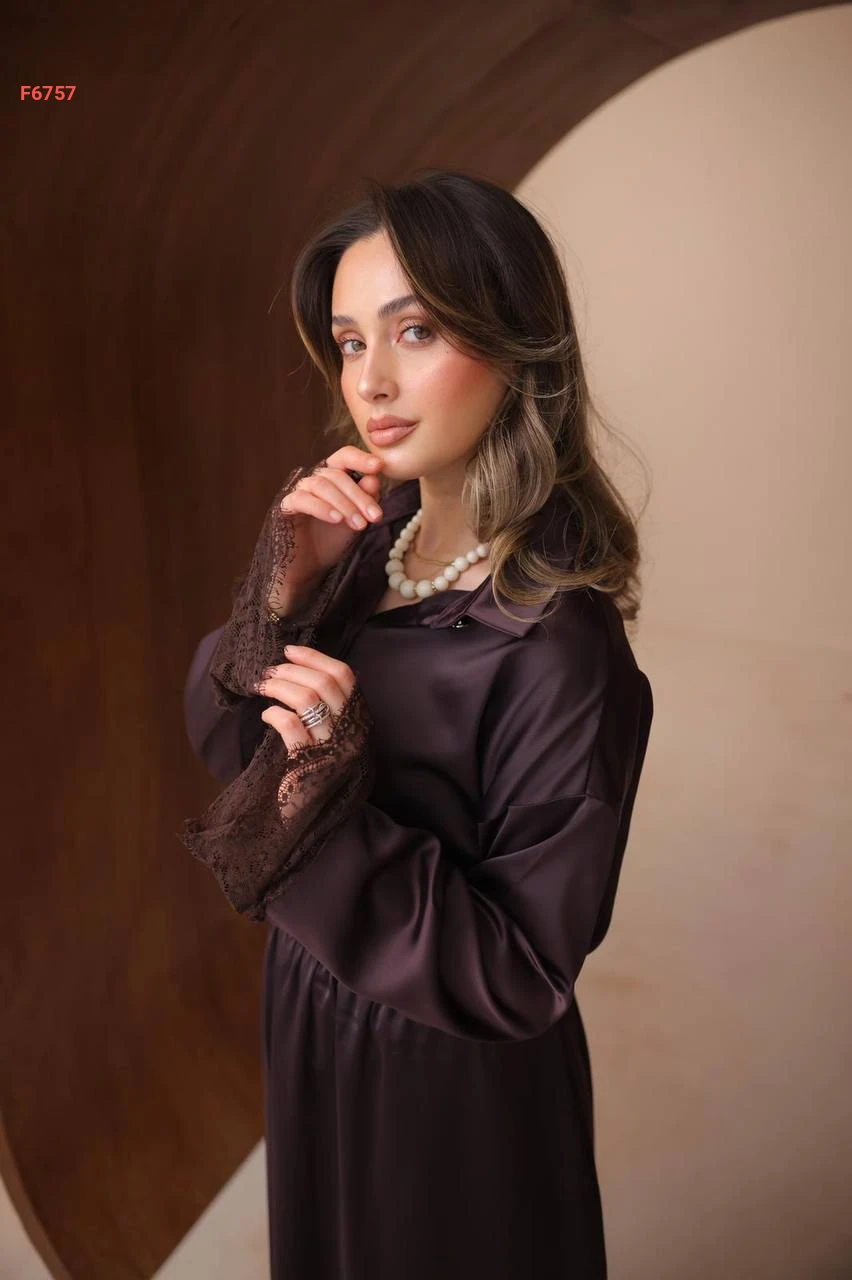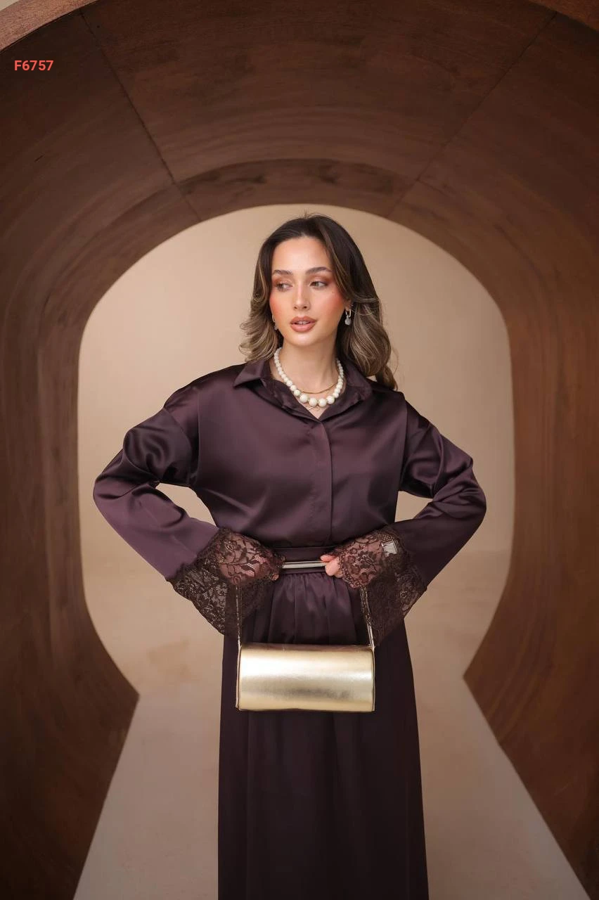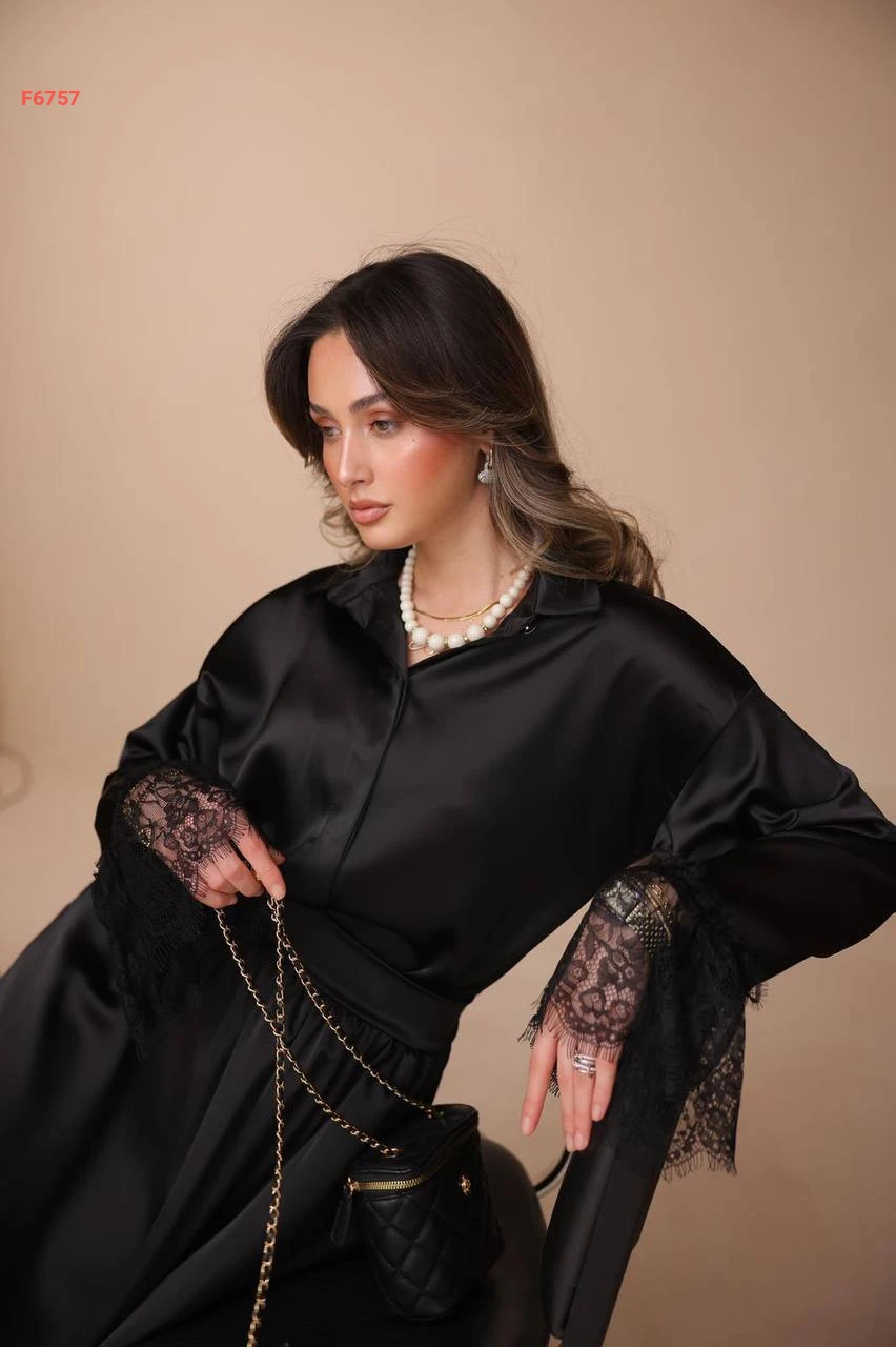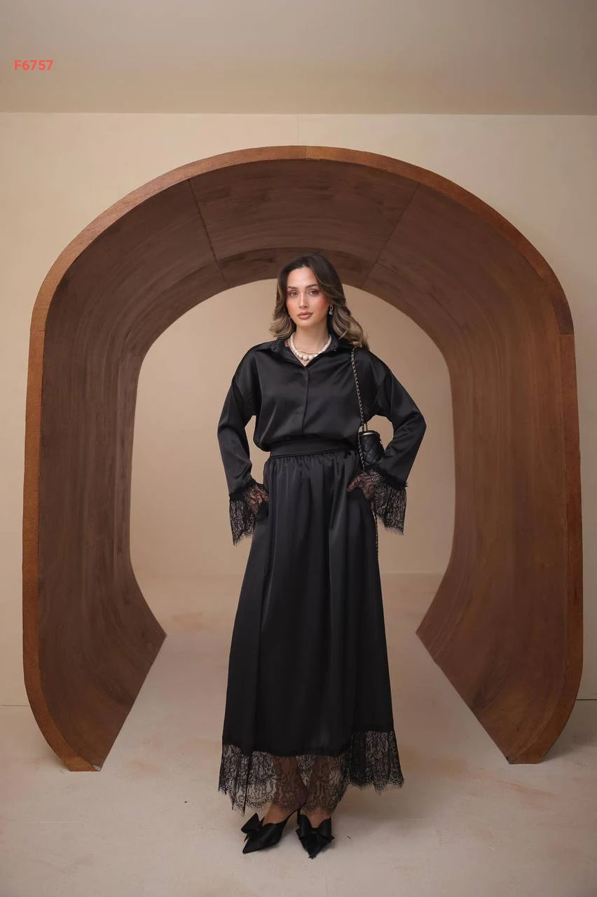 طقم تنورة طويل ساتان ودانتيل