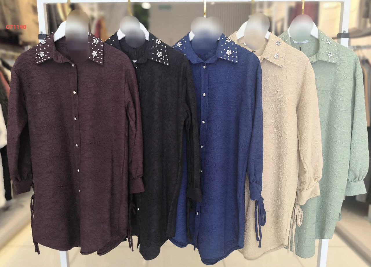 قميص طويل بياقة مطرزة أحجار