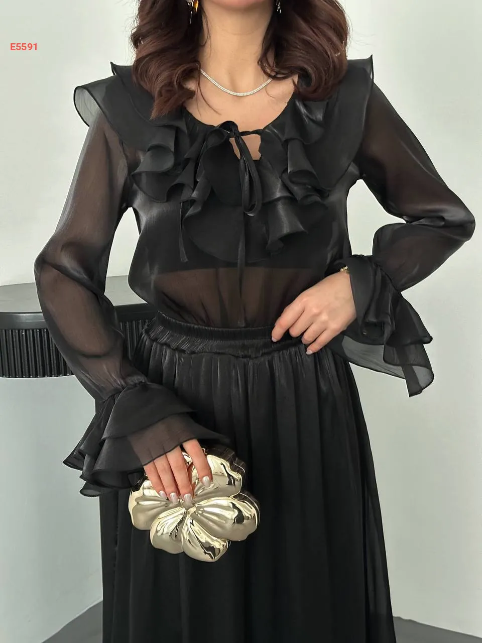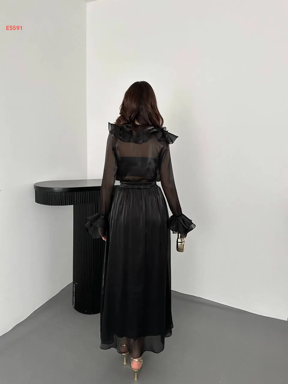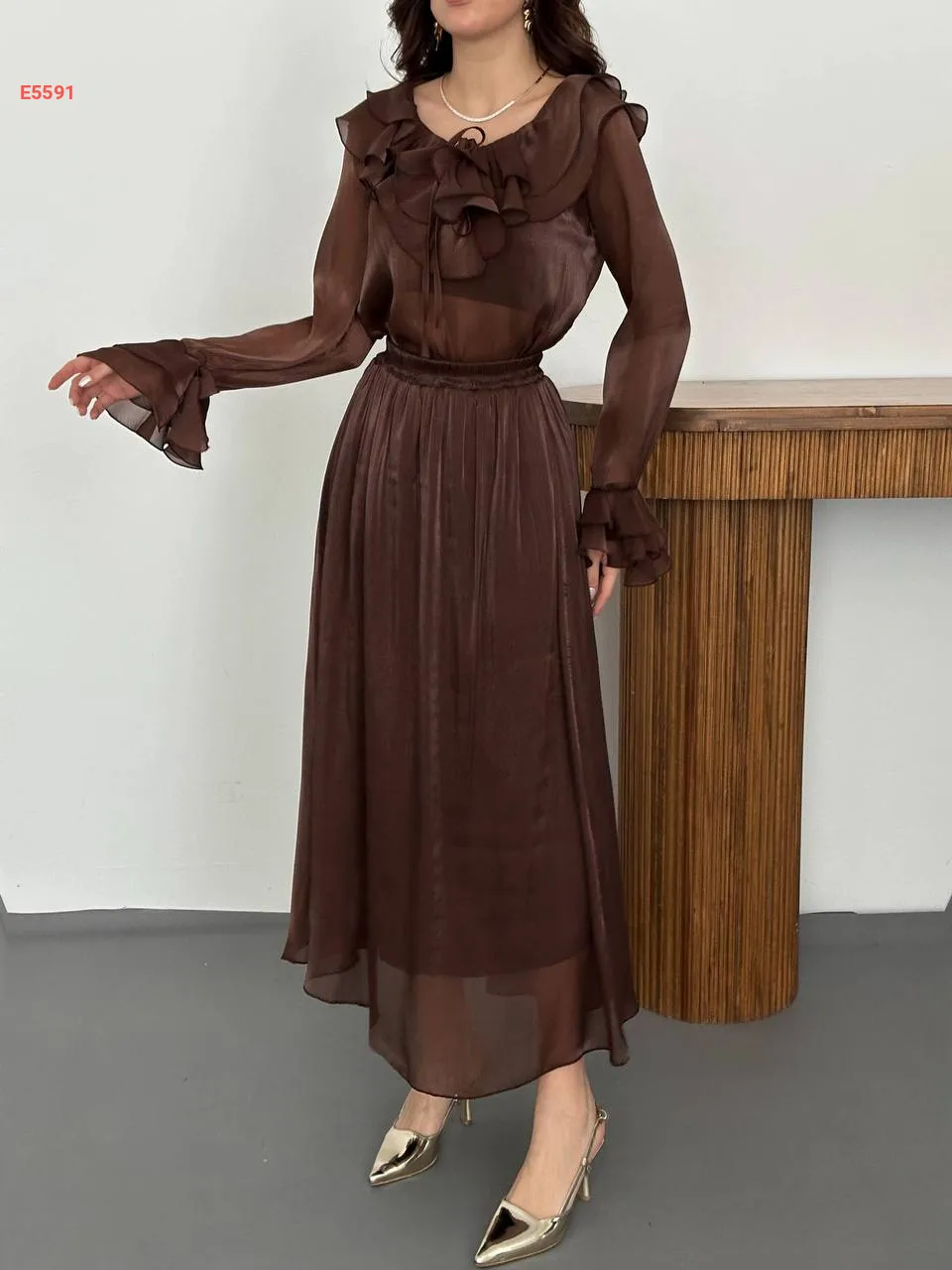 طقم تنورة طويل وبلوزة كشكش