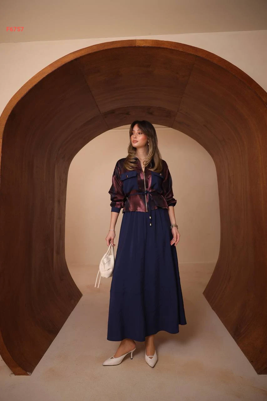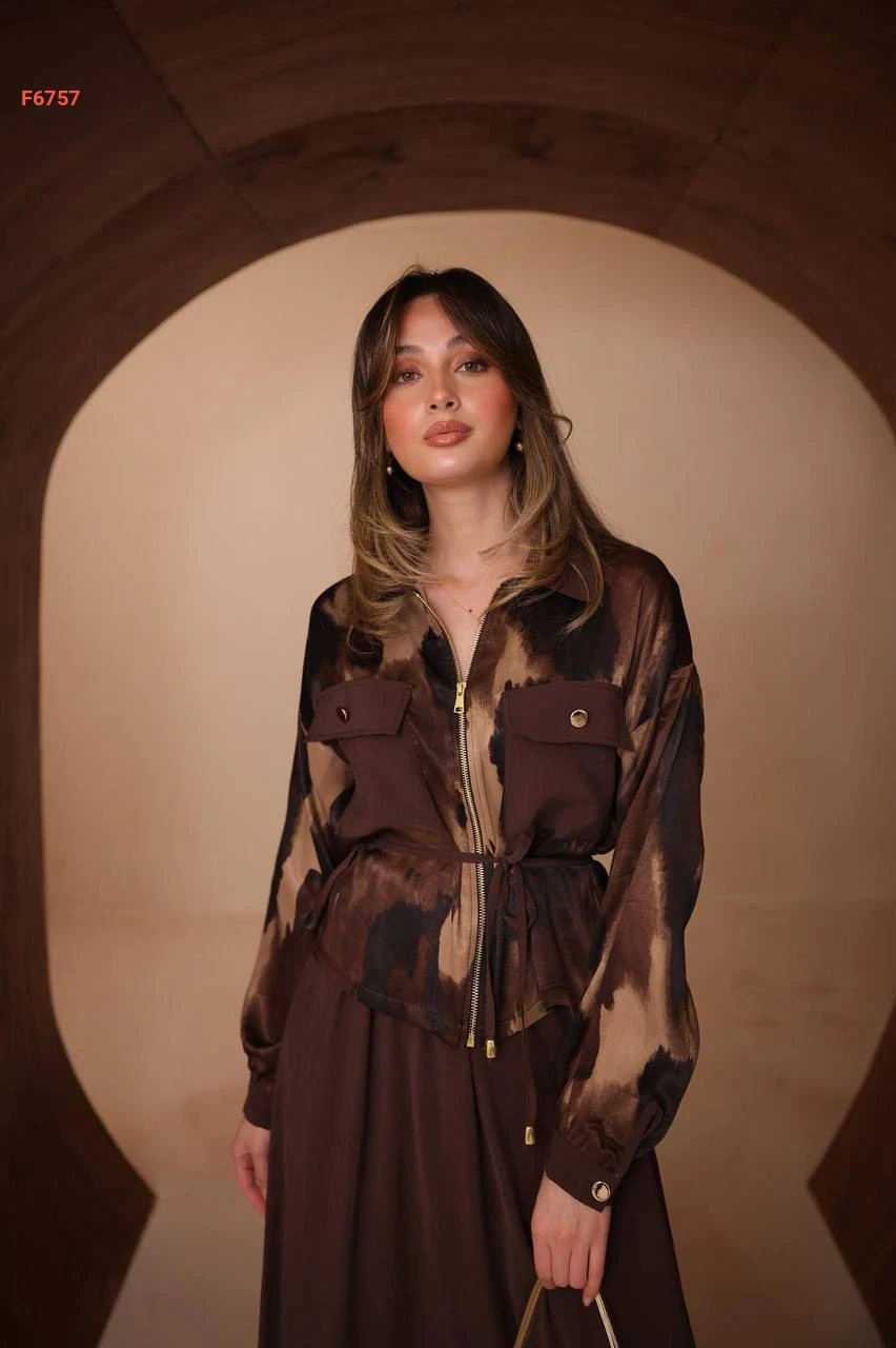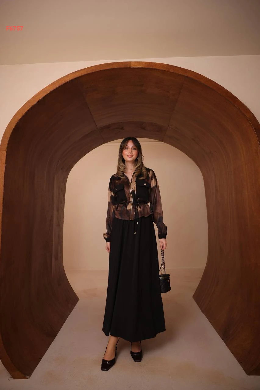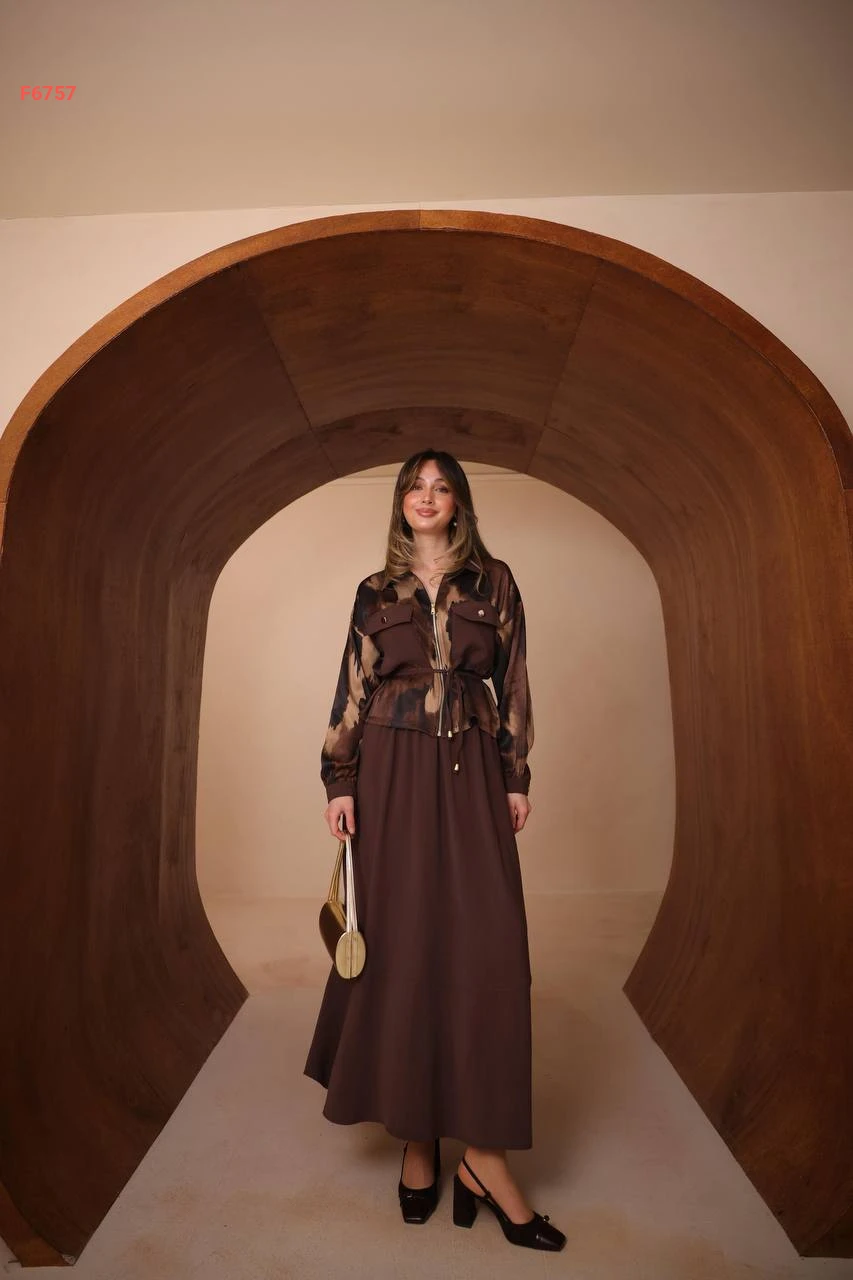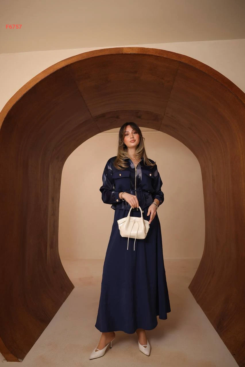 طقم تنورة طويل وجاكيت ساتان بجيوب