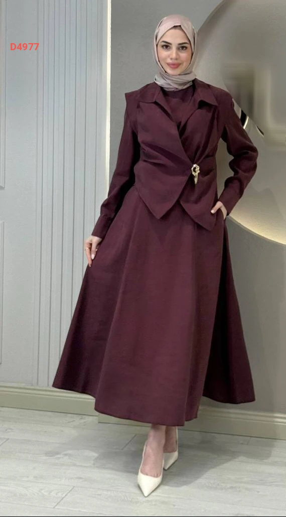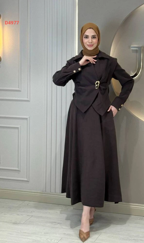 طقم تنورة طويل مع بروش دهبي
