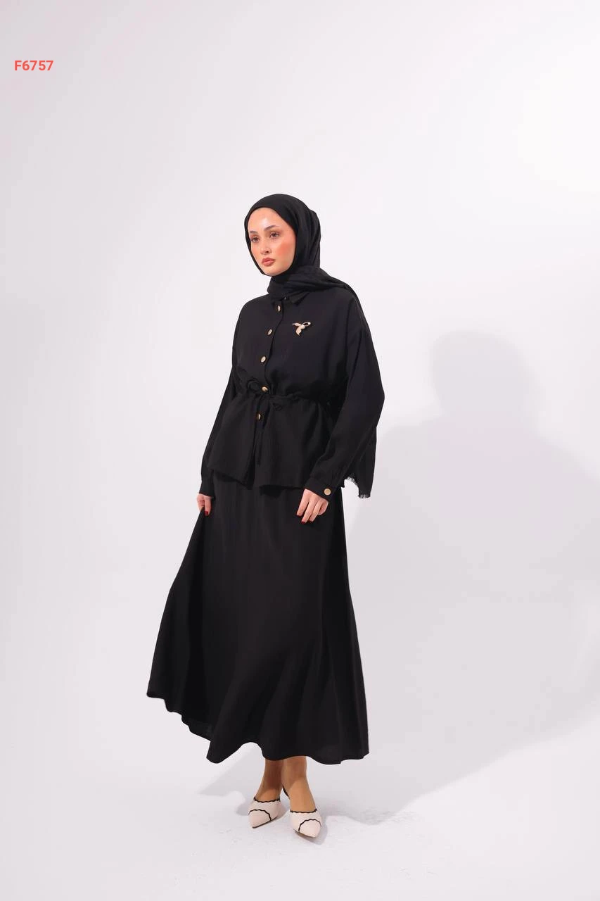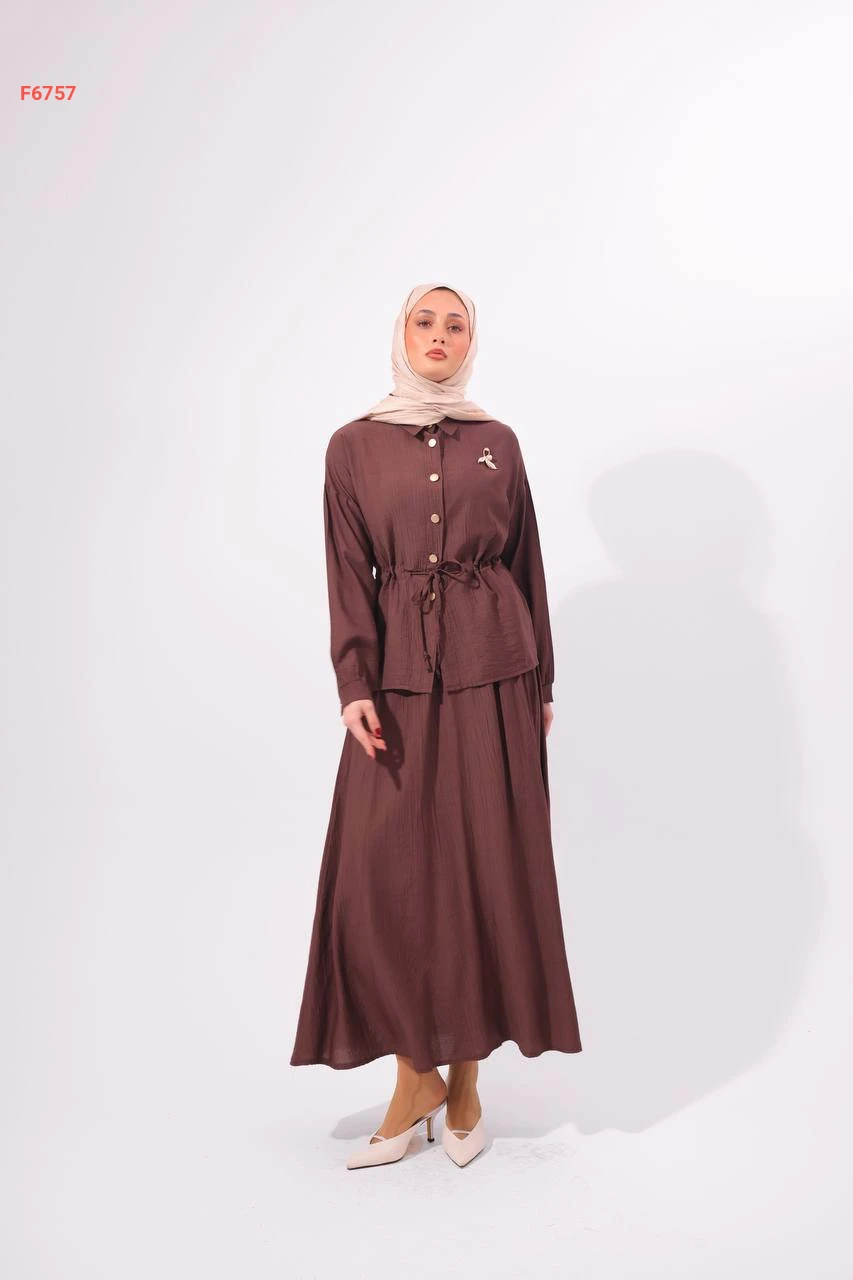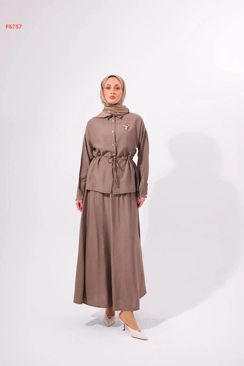 طقم تنورة طويل مع قميص وبروش