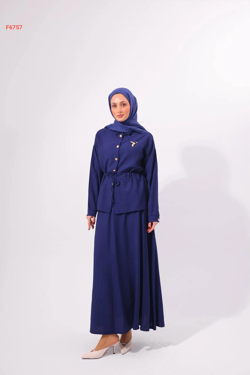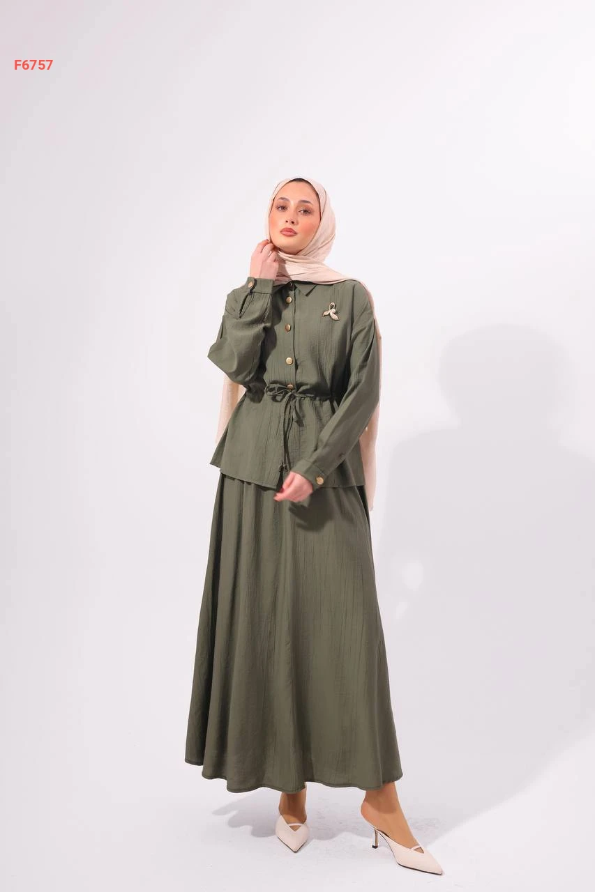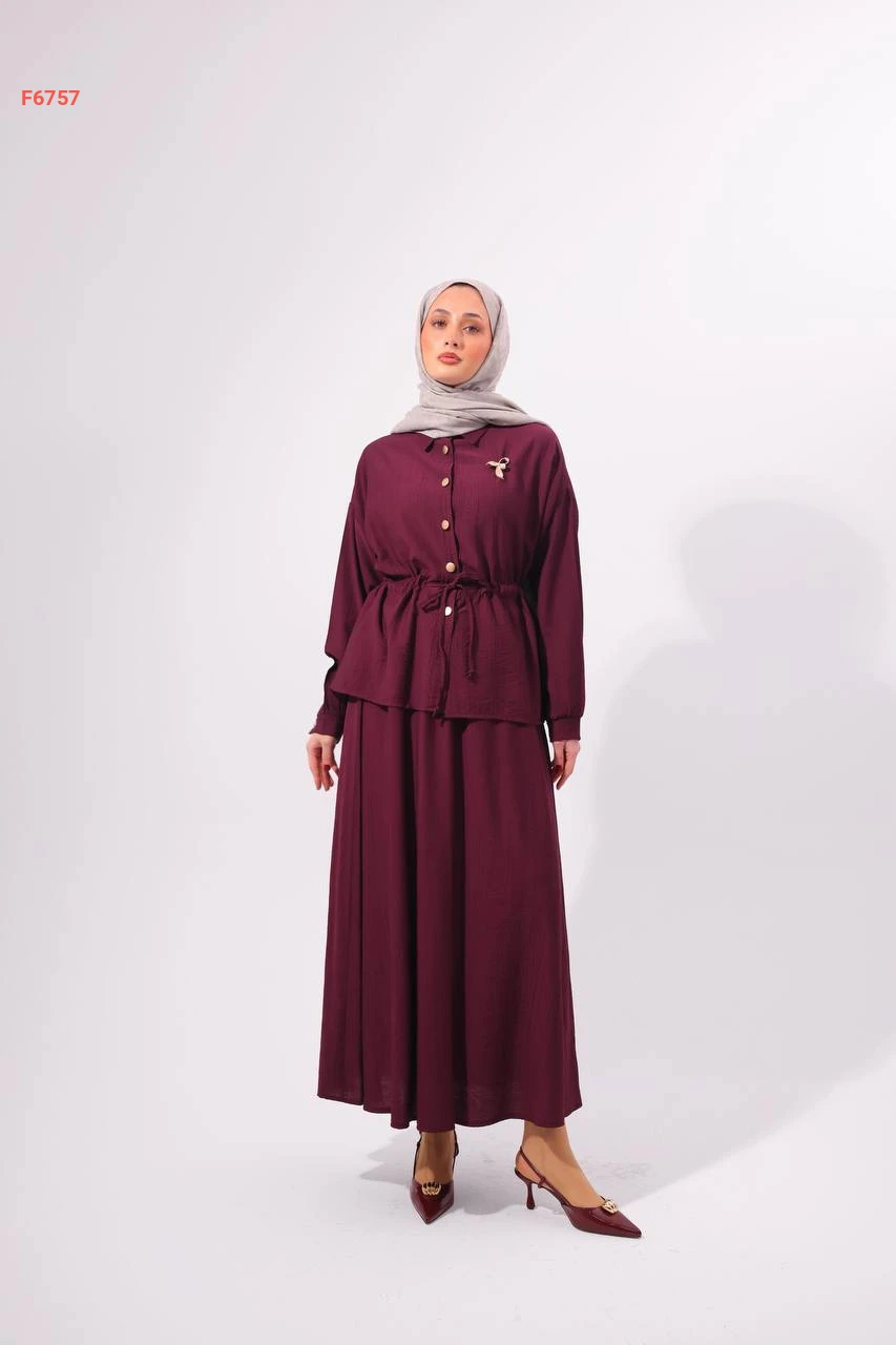 طقم تنورة طويل مع قميص وبروش