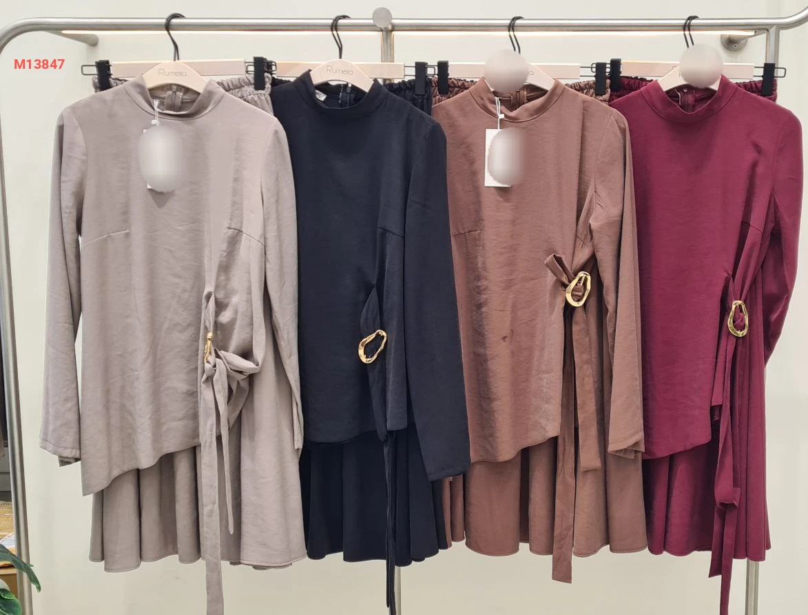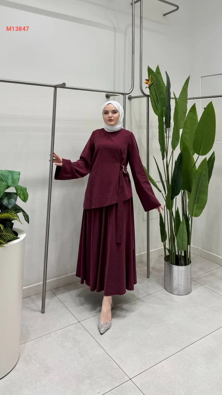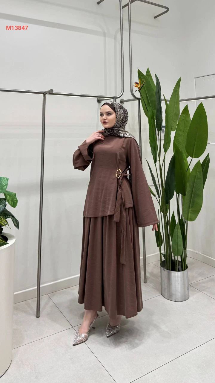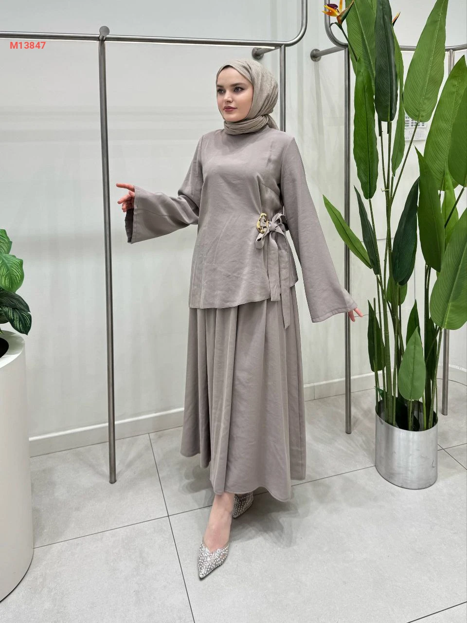 طقم تنورة طويل وبلوزة بربطة وإبزيم