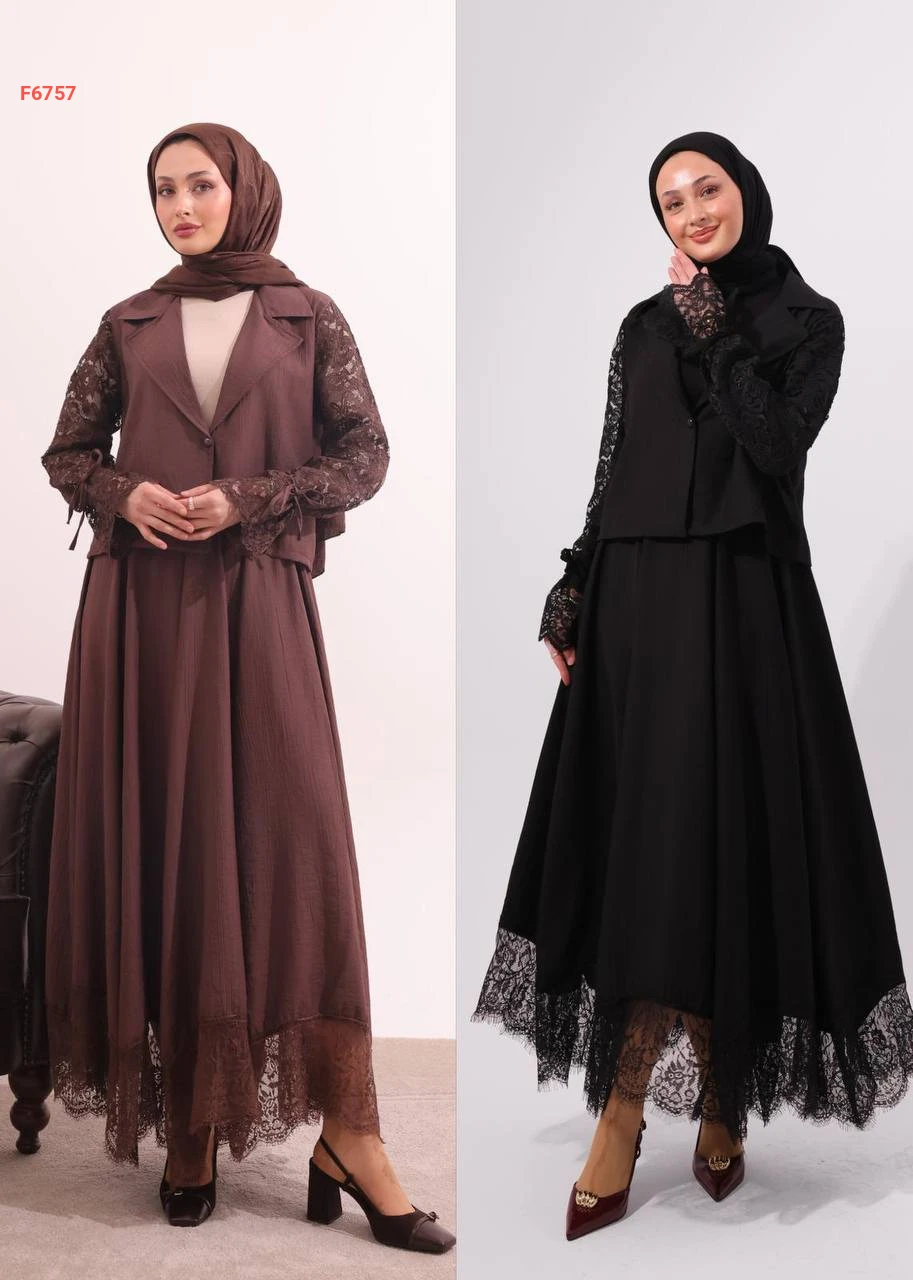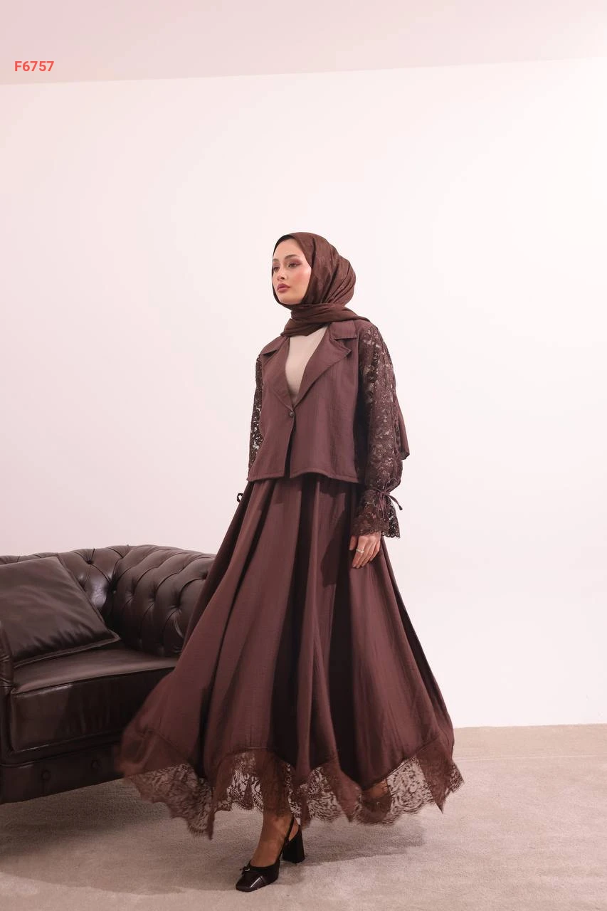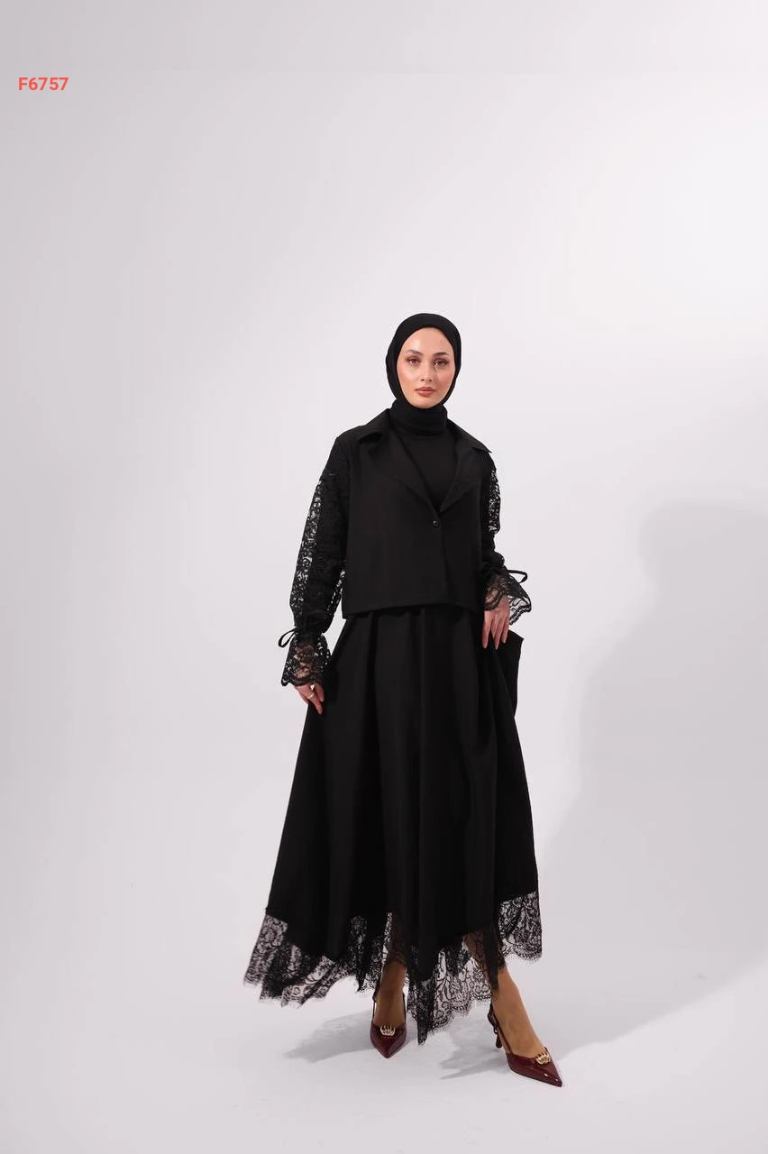 طقم تنورة طويل بتفاصيل دانتيل أنيقة