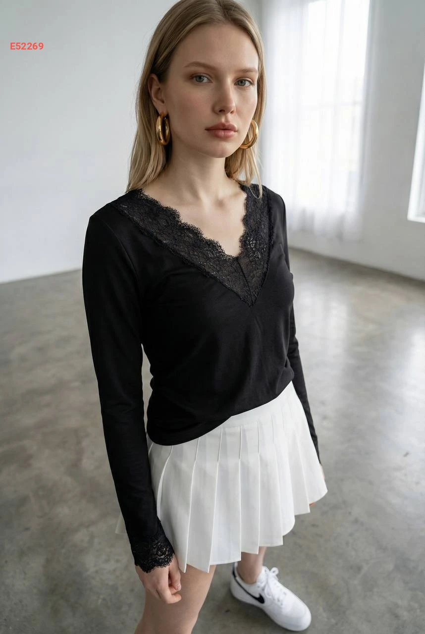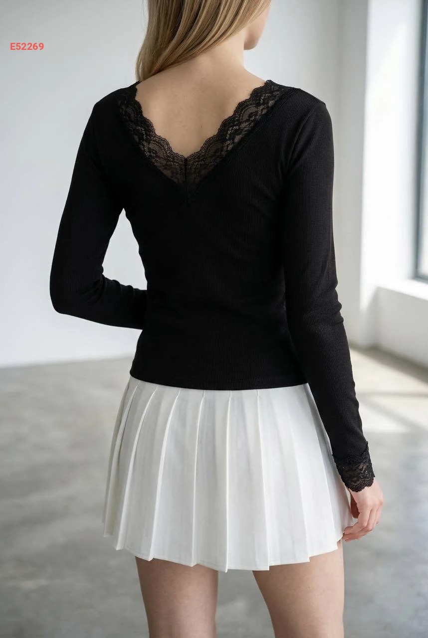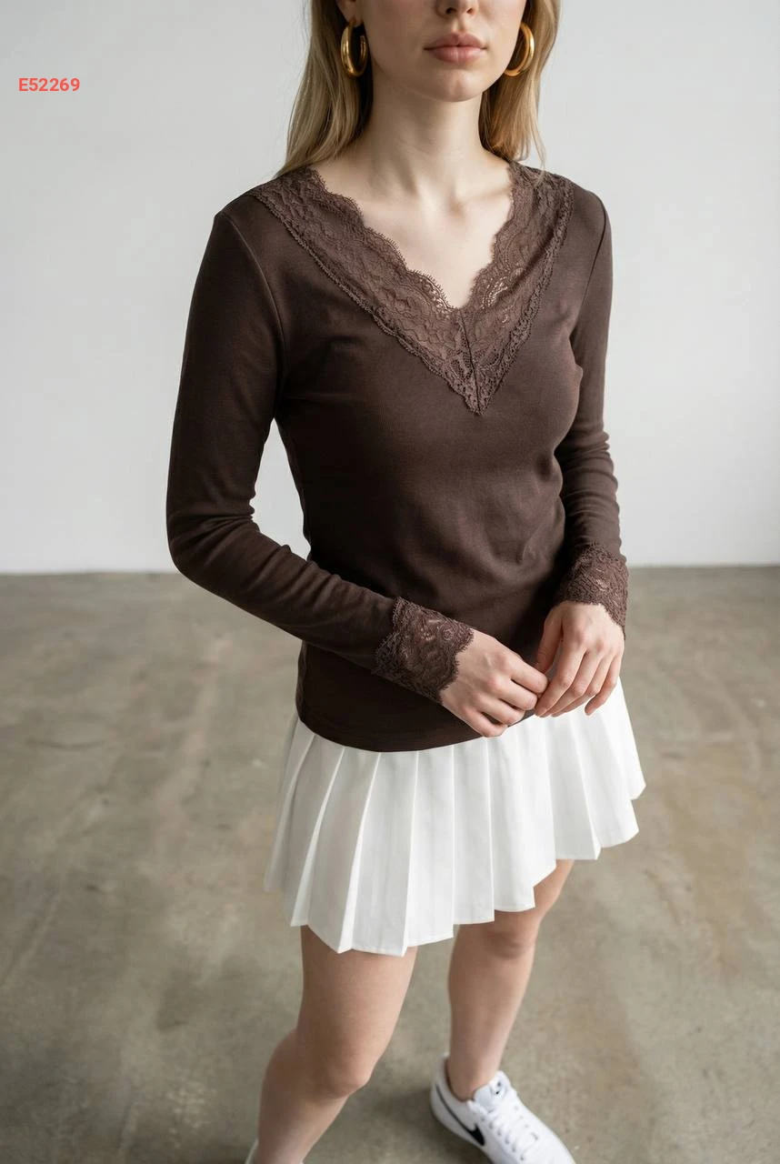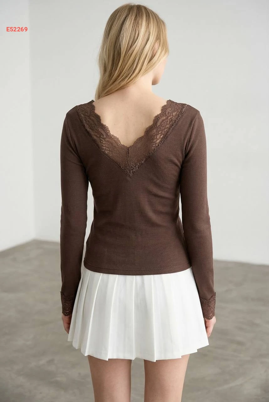 بلوزة كم طويل قبة v بدانتيل