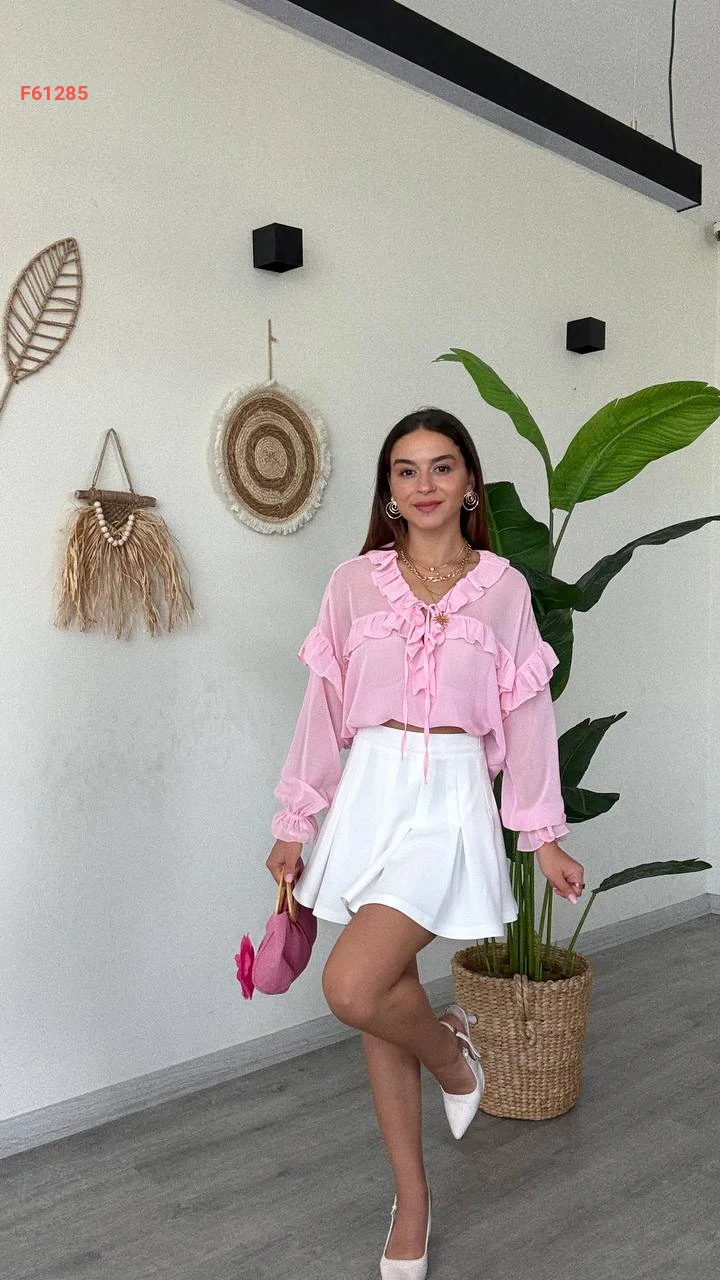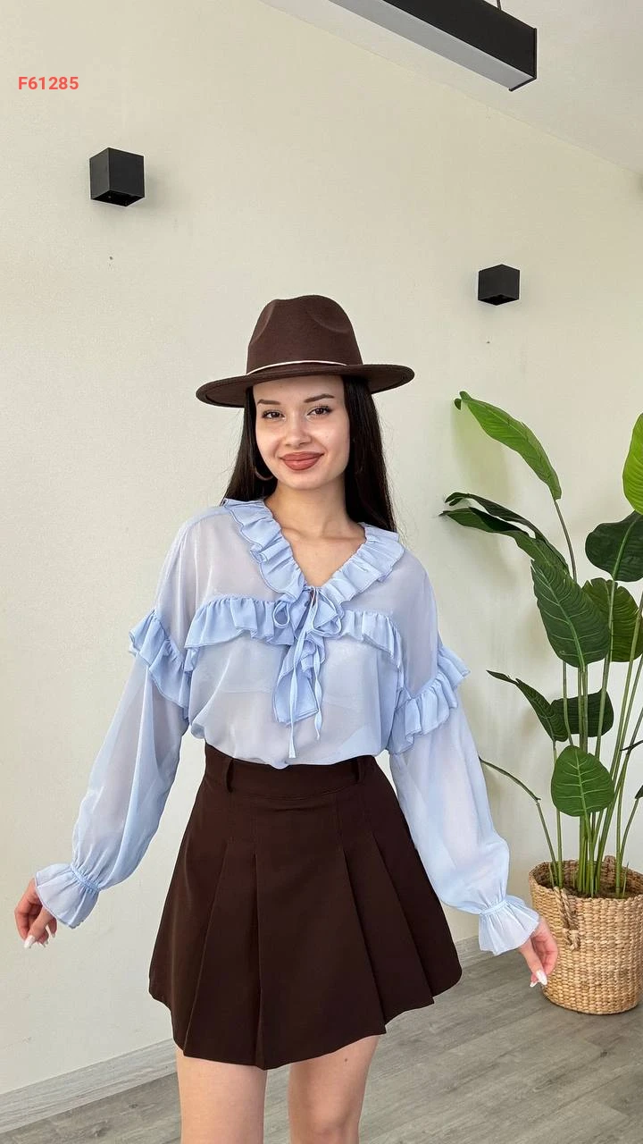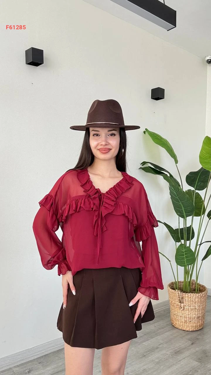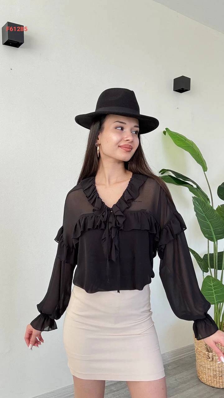 بلوزة كم طويل شيفون بتفاصيل كشكش