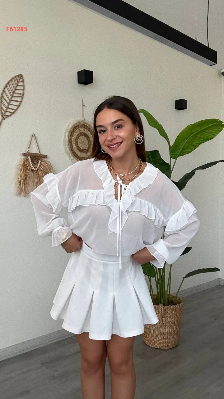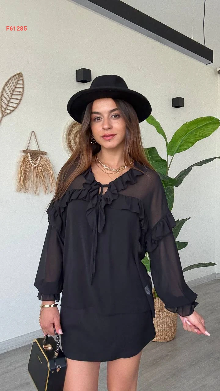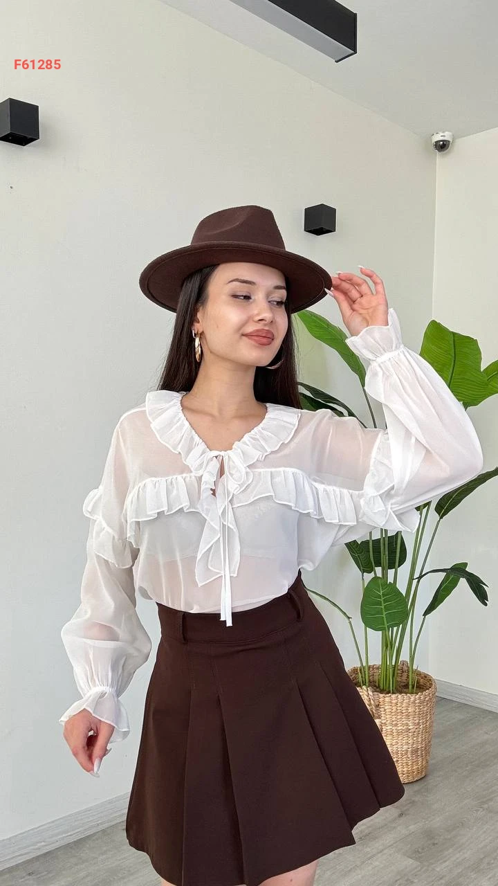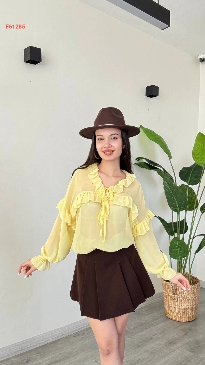 بلوزة كم طويل شيفون بتفاصيل كشكش