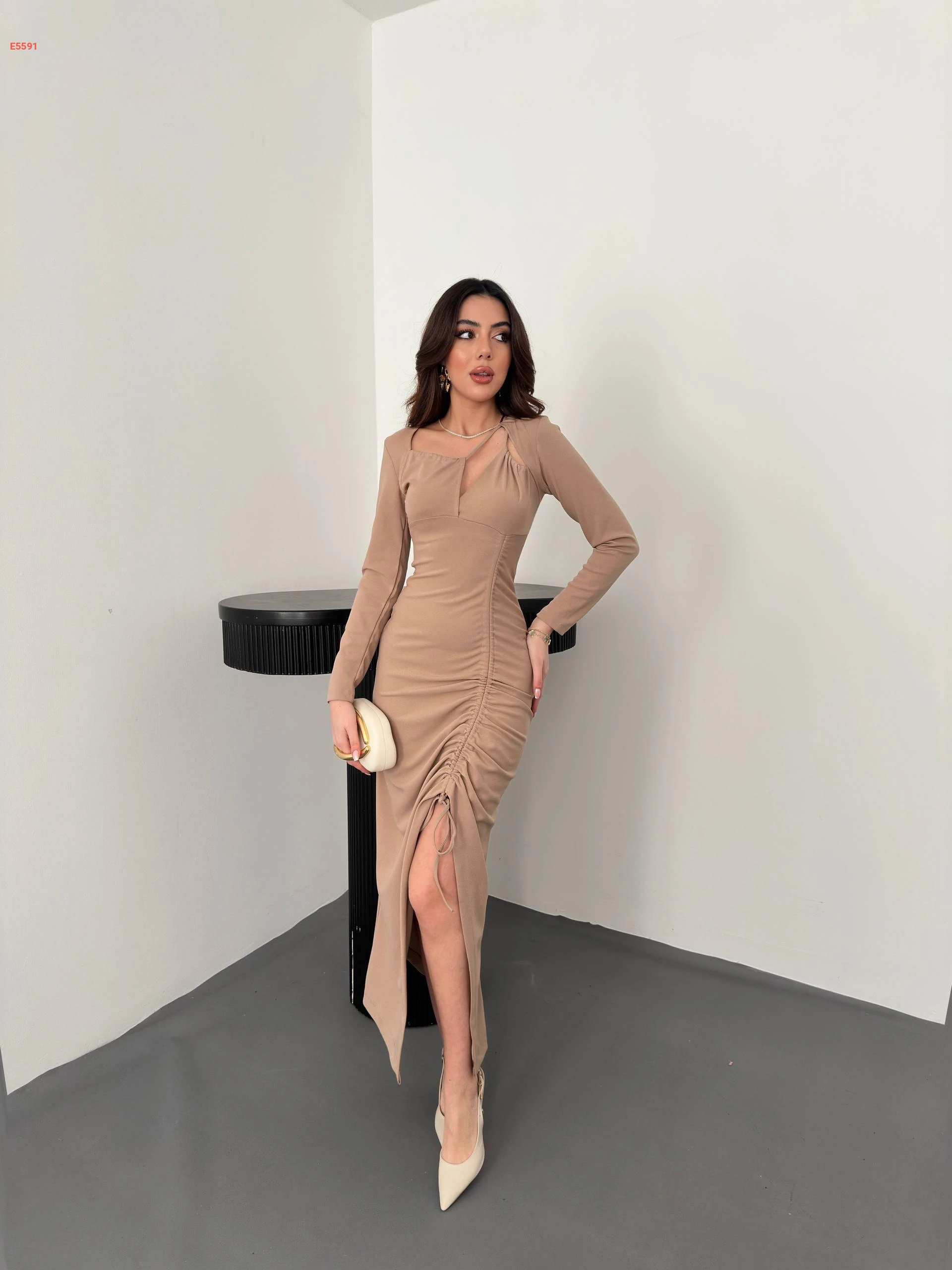 فستان كم طويل زم بربطة جانبية