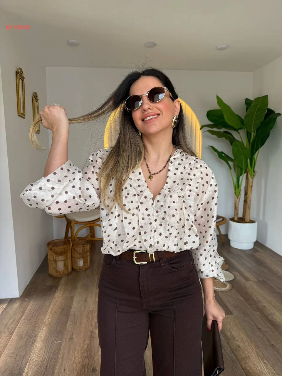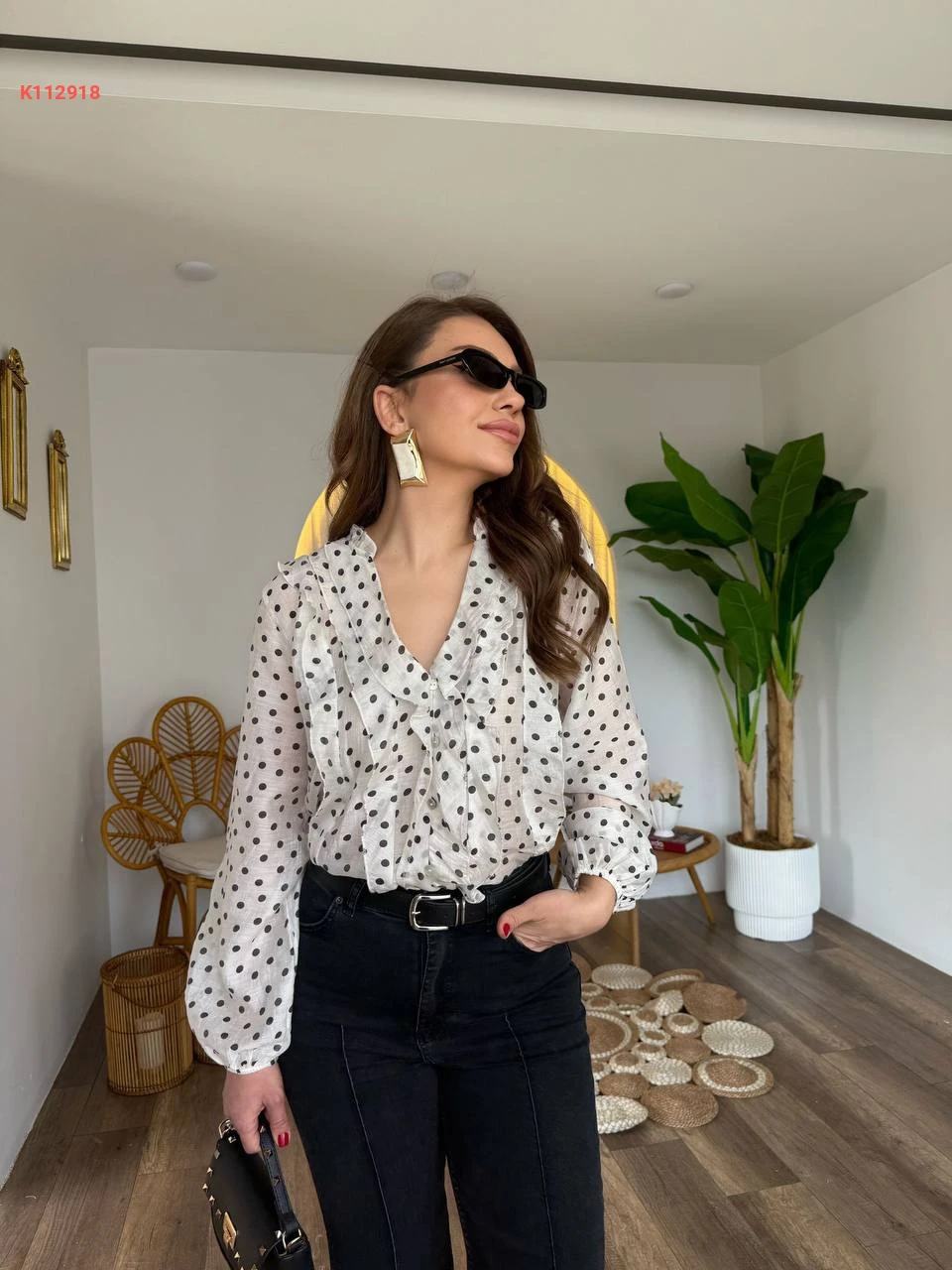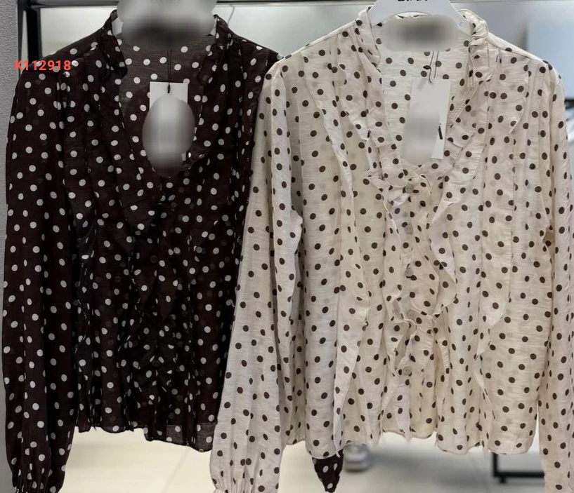 بلوزة كم طويل منقطة بأزرار