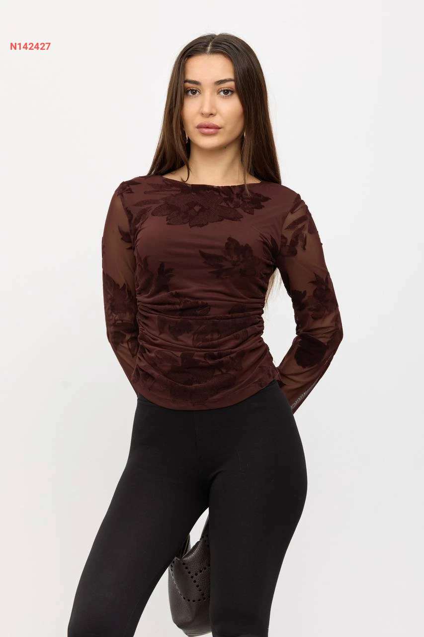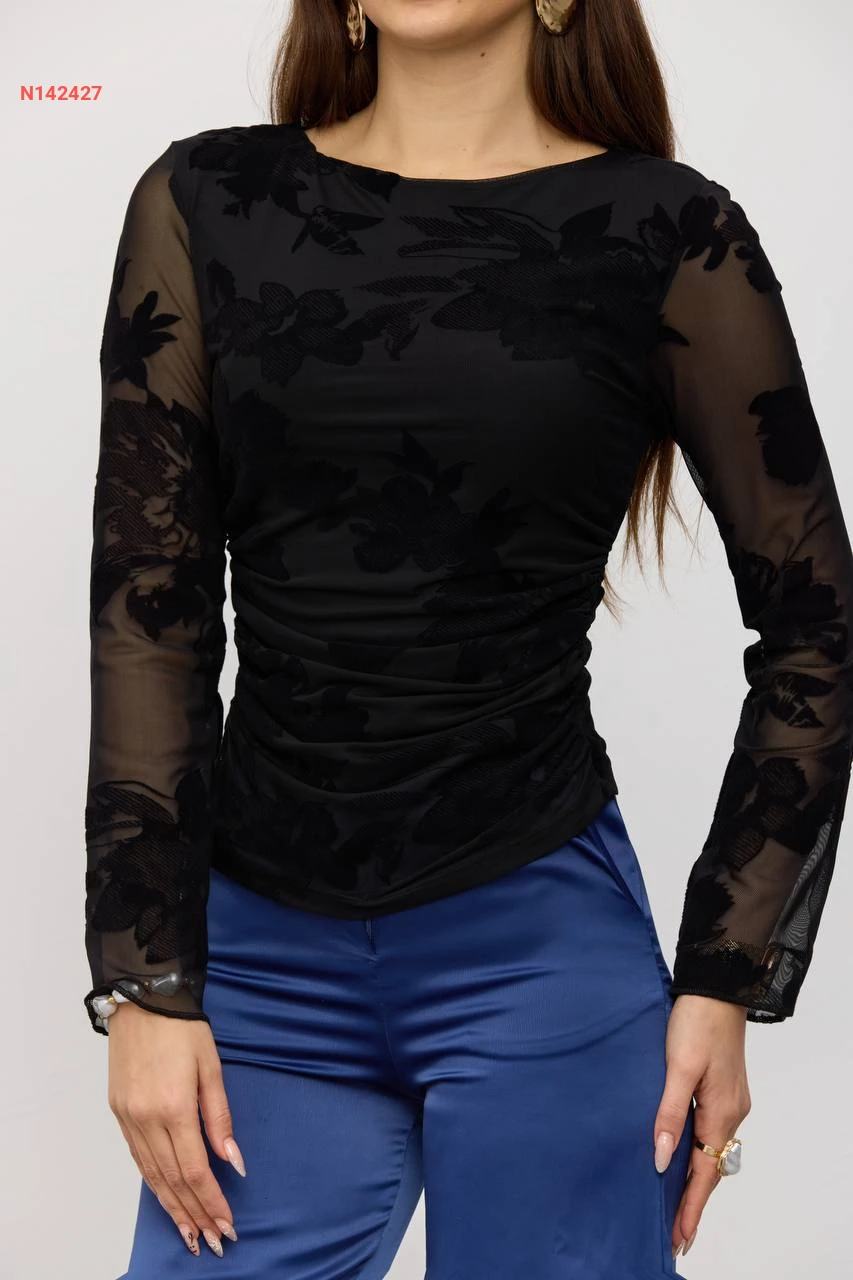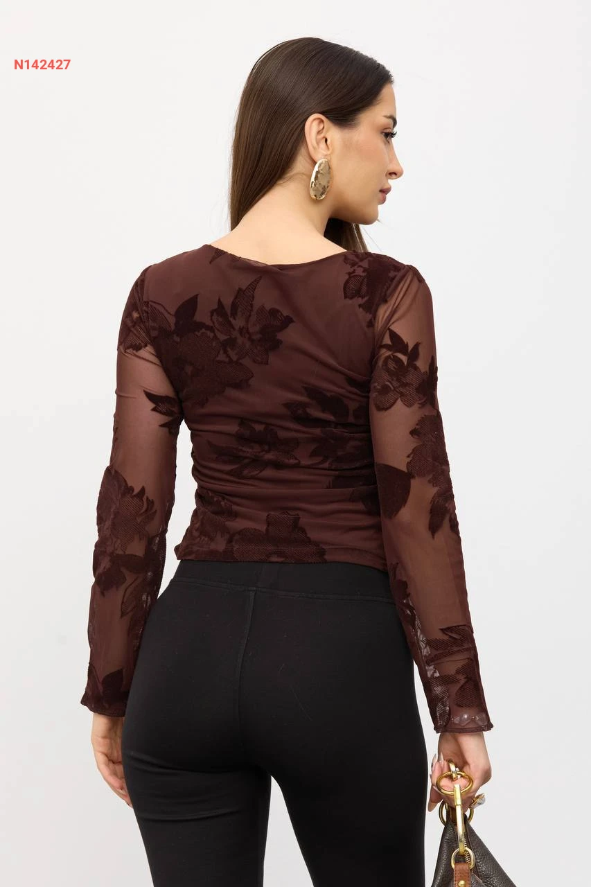 بلوزة كم طويل شفاف منقوشة