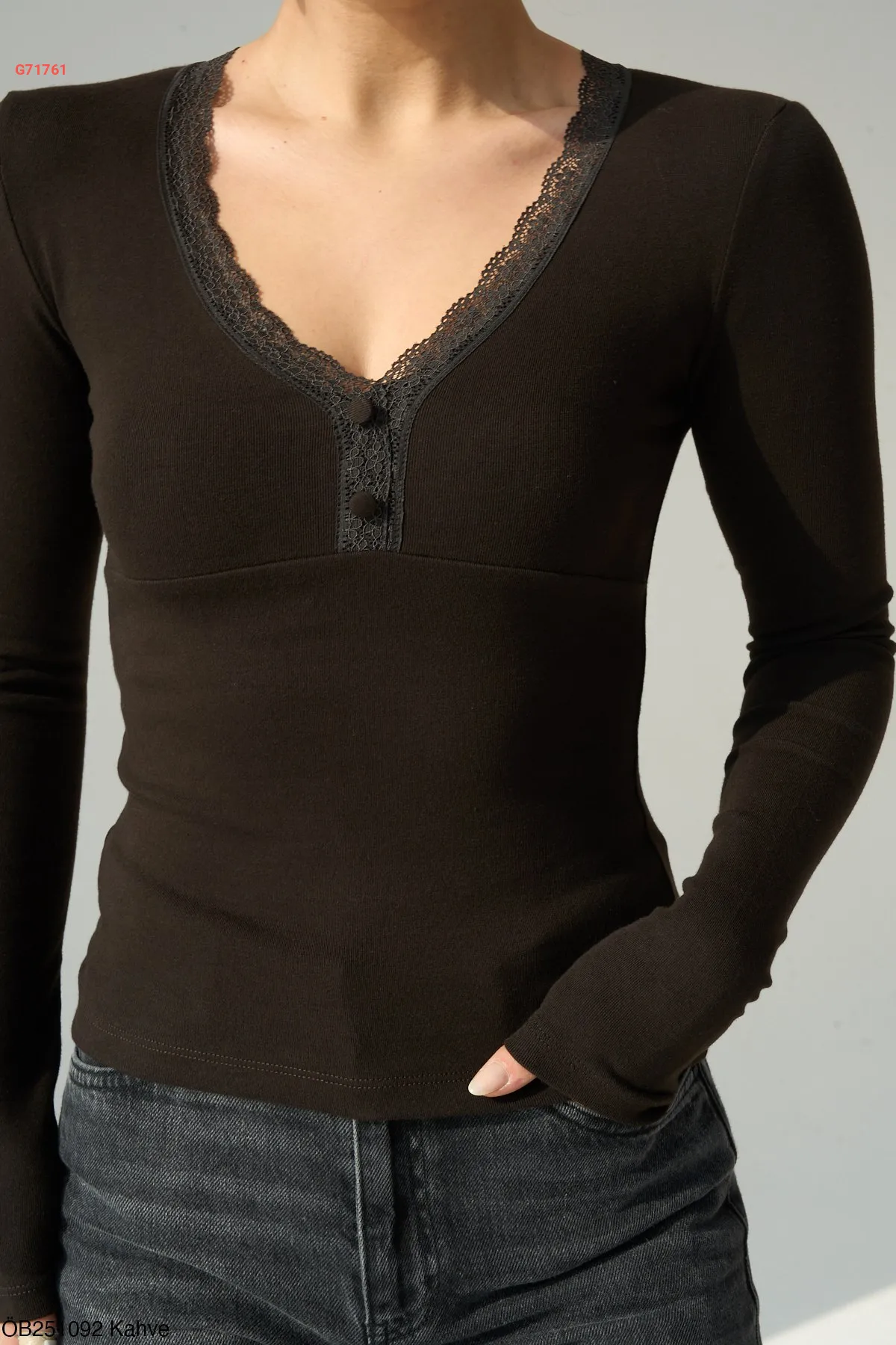 كنزة كم طويل قبة v بدانتيل