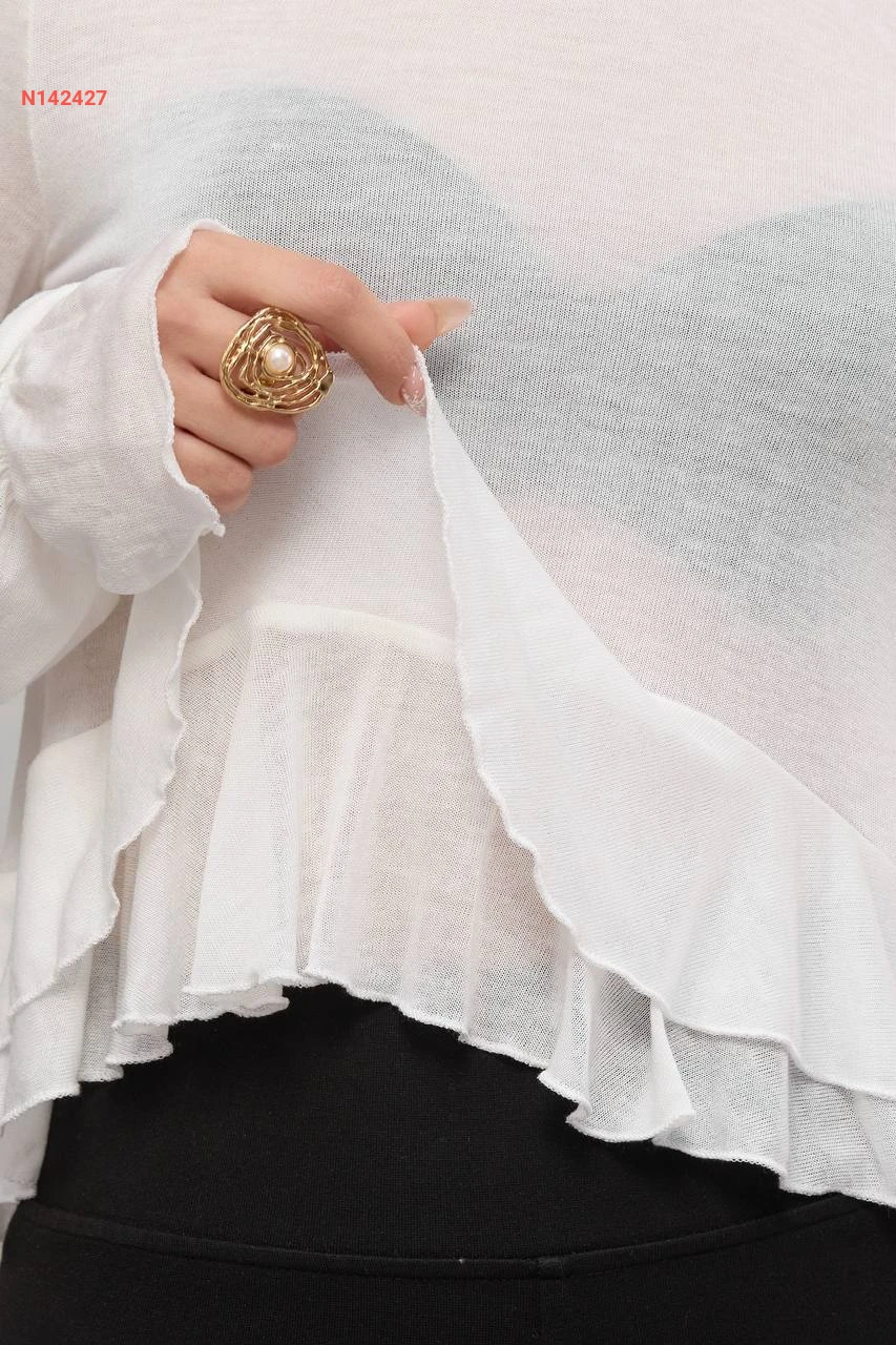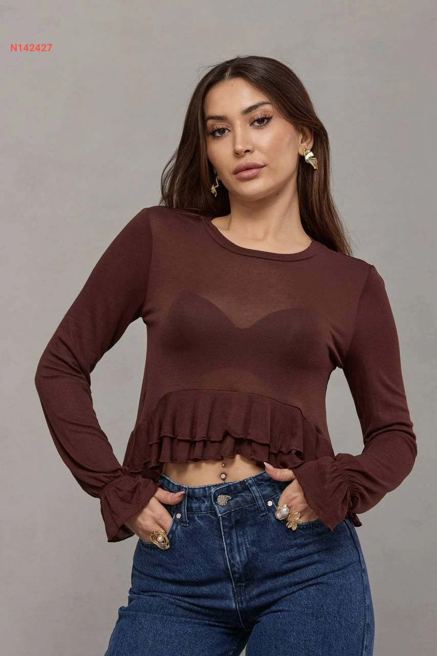 بلوزة كم طويل شفافة بتفاصيل كشكش