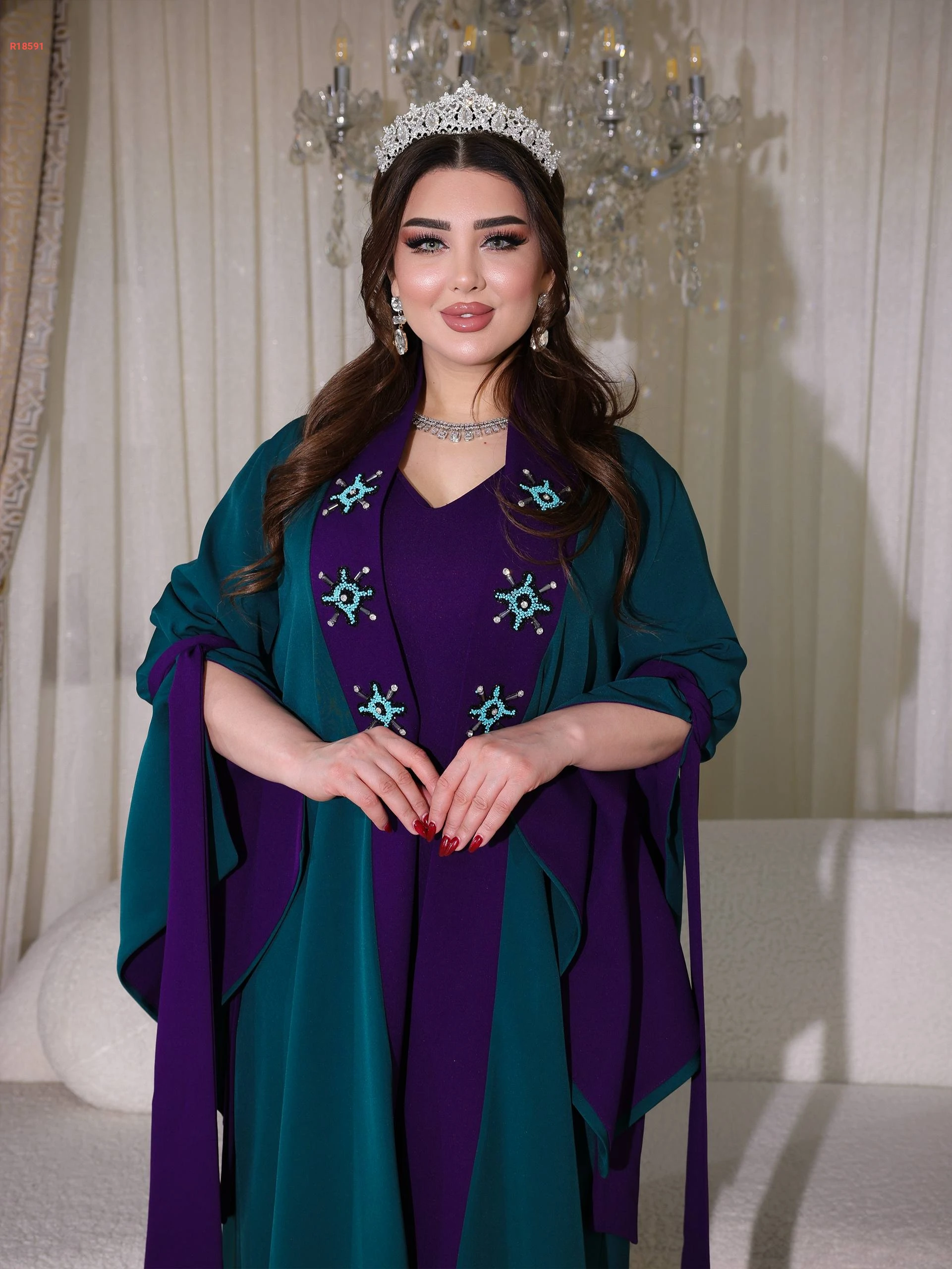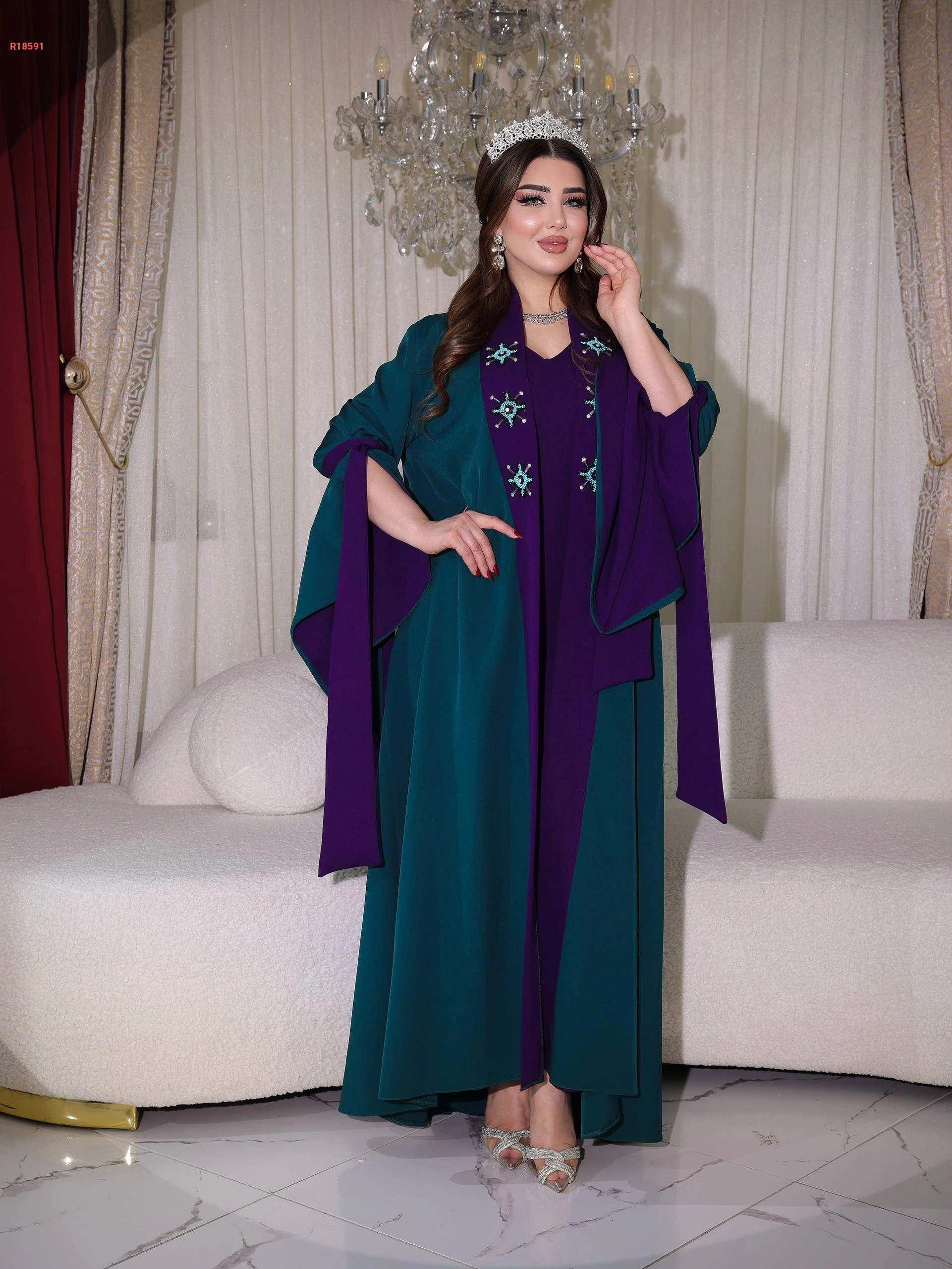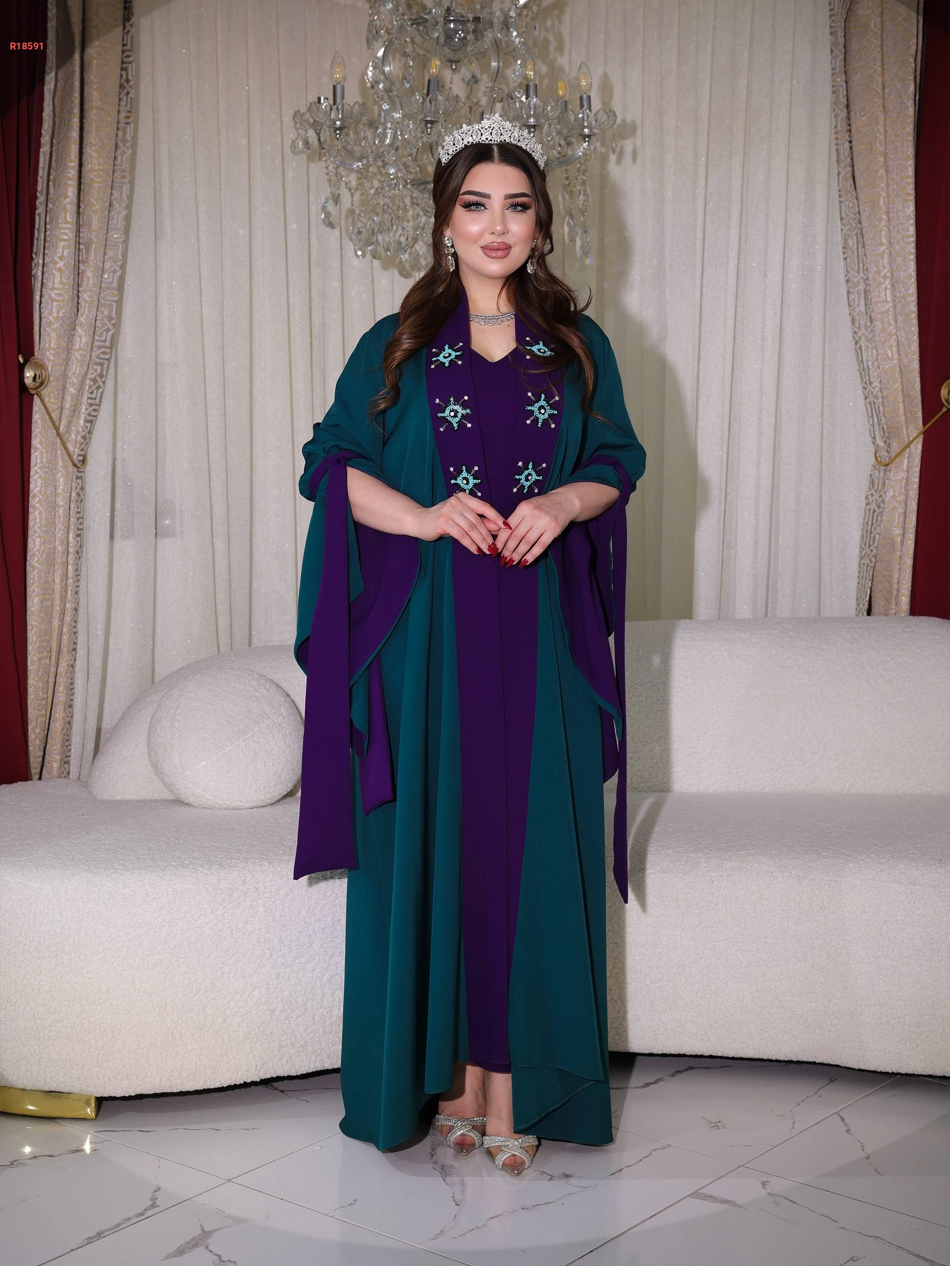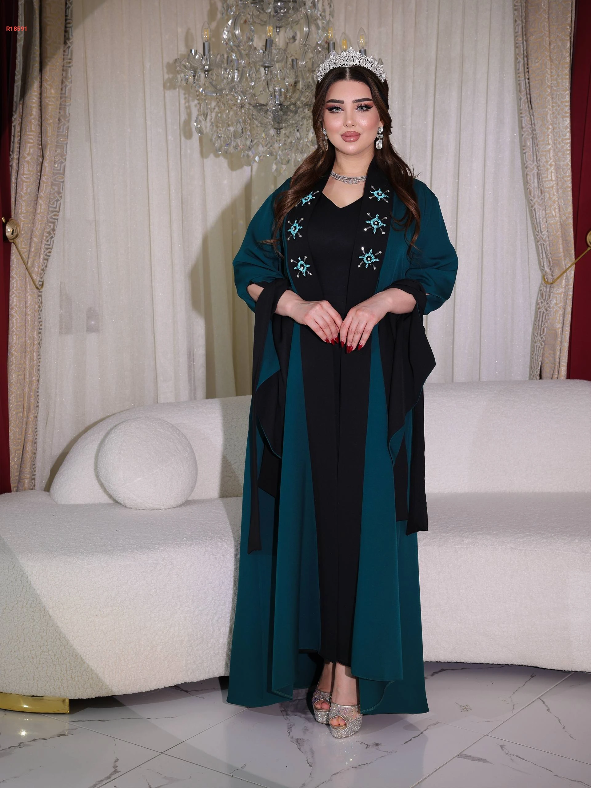 عباية كم طويل فتح قطعتين مع فستان سادة بتطريز ناعم