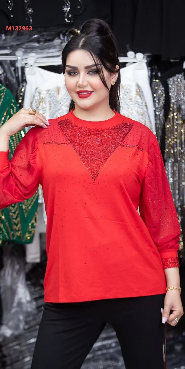 بلوزة كم طويل مرصعة بتفاصيل حجرية