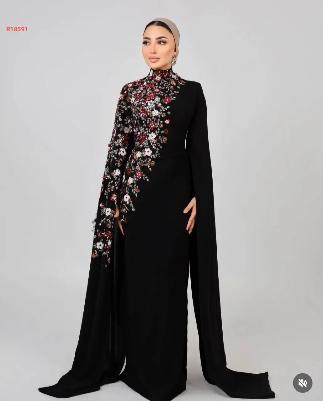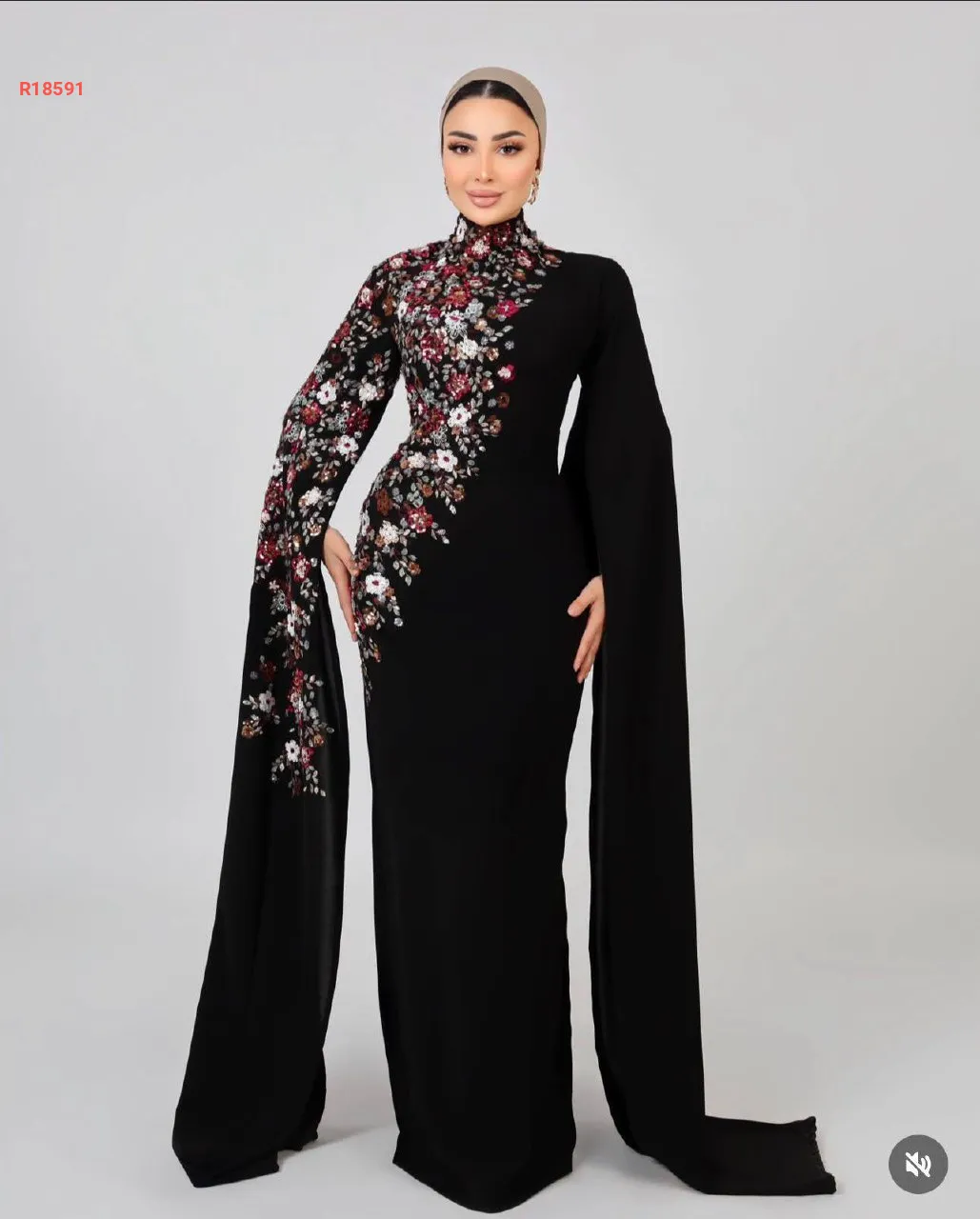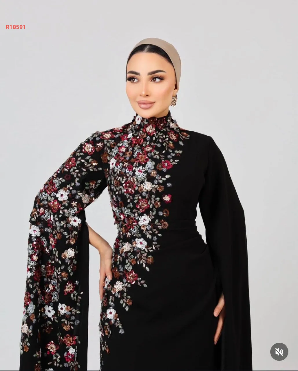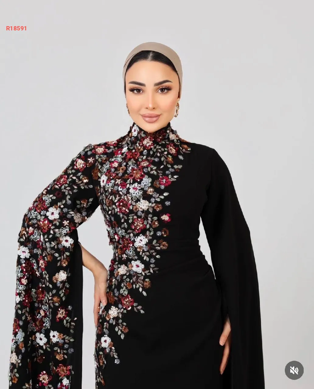 فستان محتشم أنيق بلون الأسود الكلاسيكي، مطرّز بالكامل بزهور راقية تضيف لمسة فنية ساحرة.