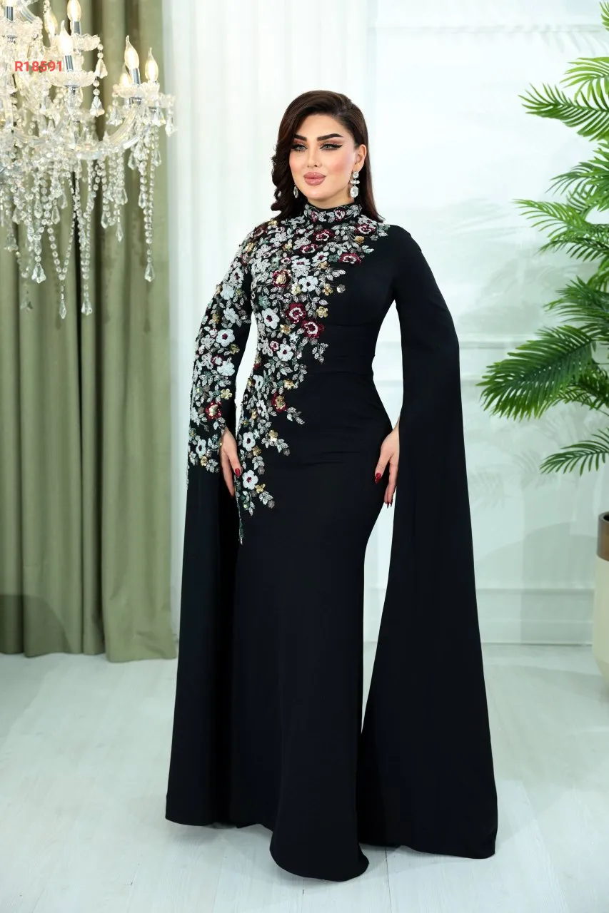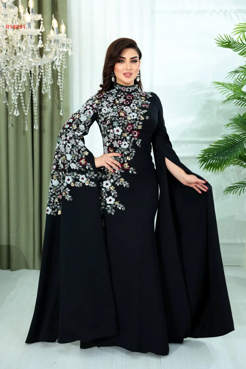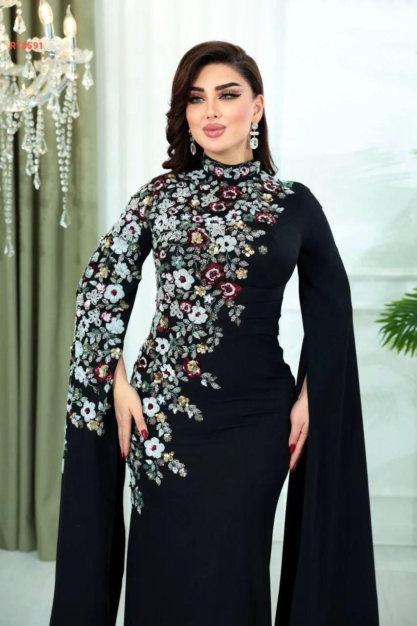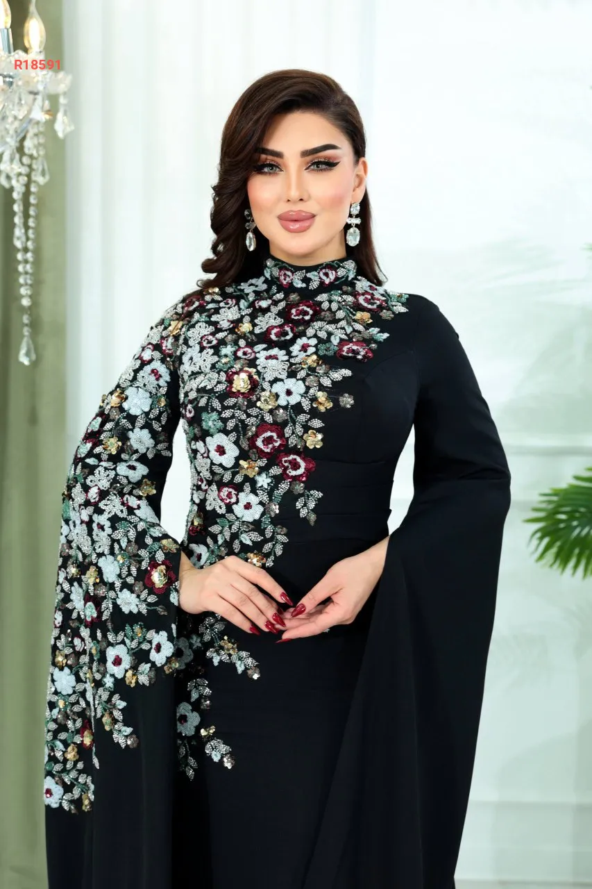 فستان محتشم أنيق بلون الأسود الكلاسيكي، مطرّز بالكامل بزهور راقية تضيف لمسة فنية ساحرة.