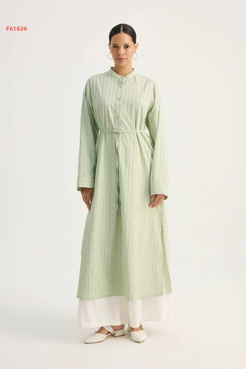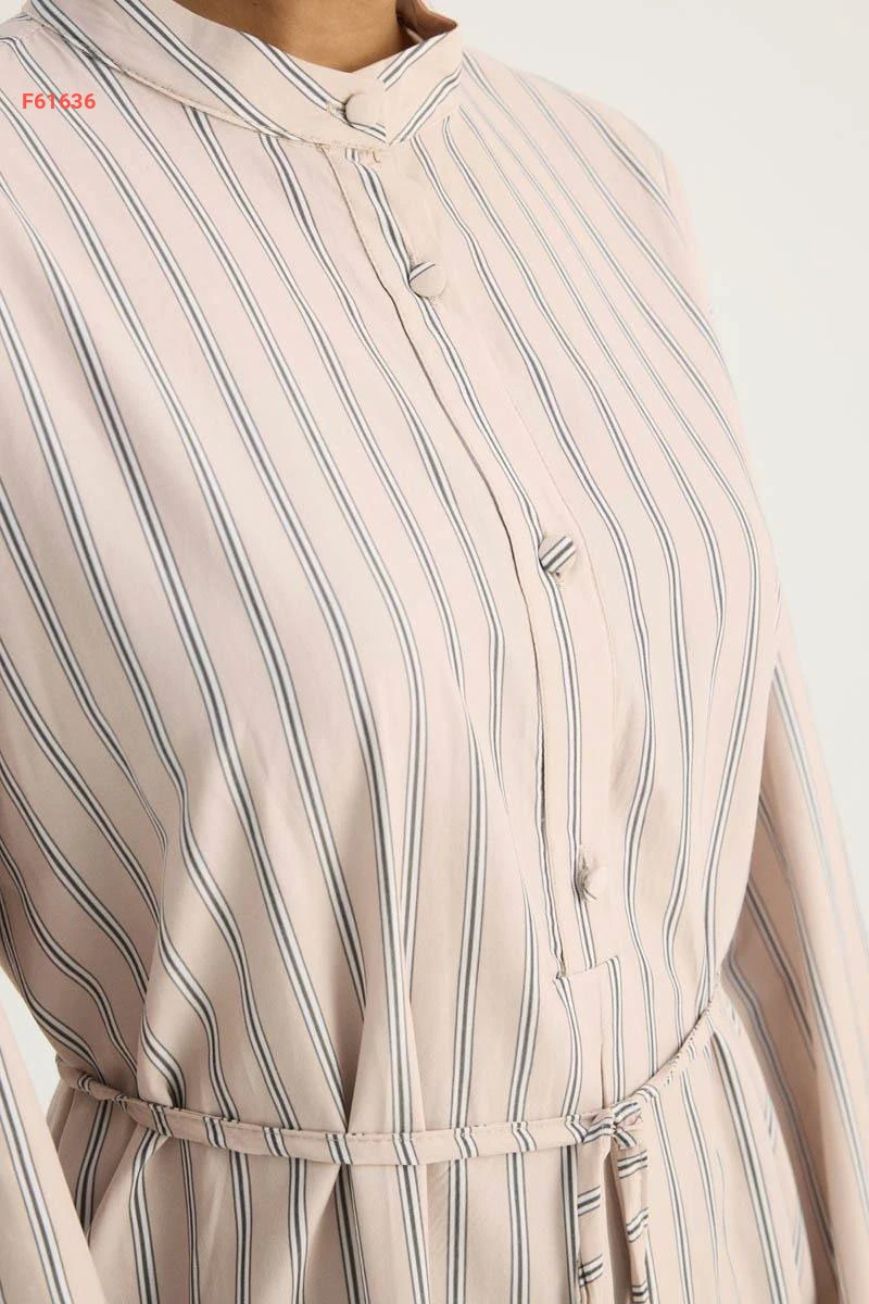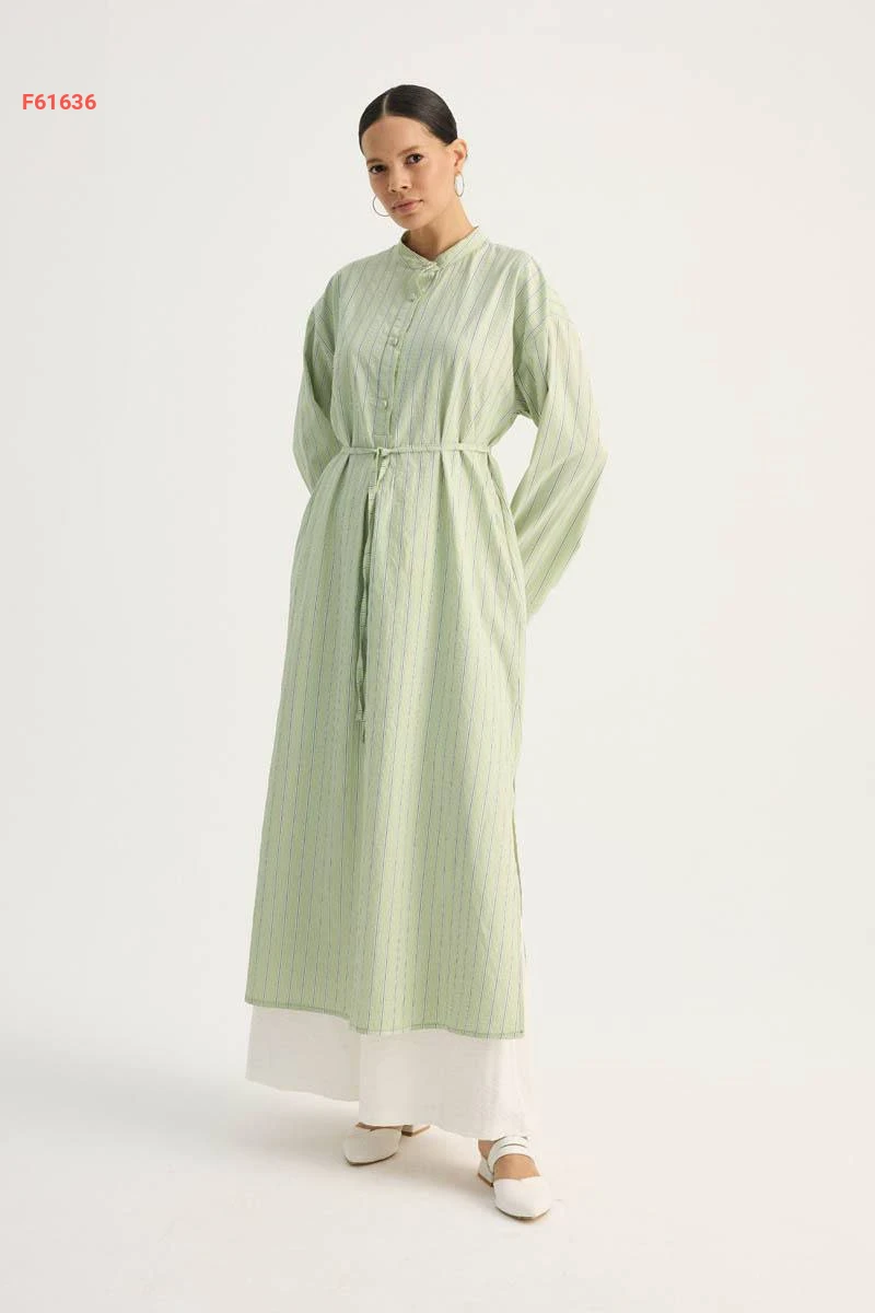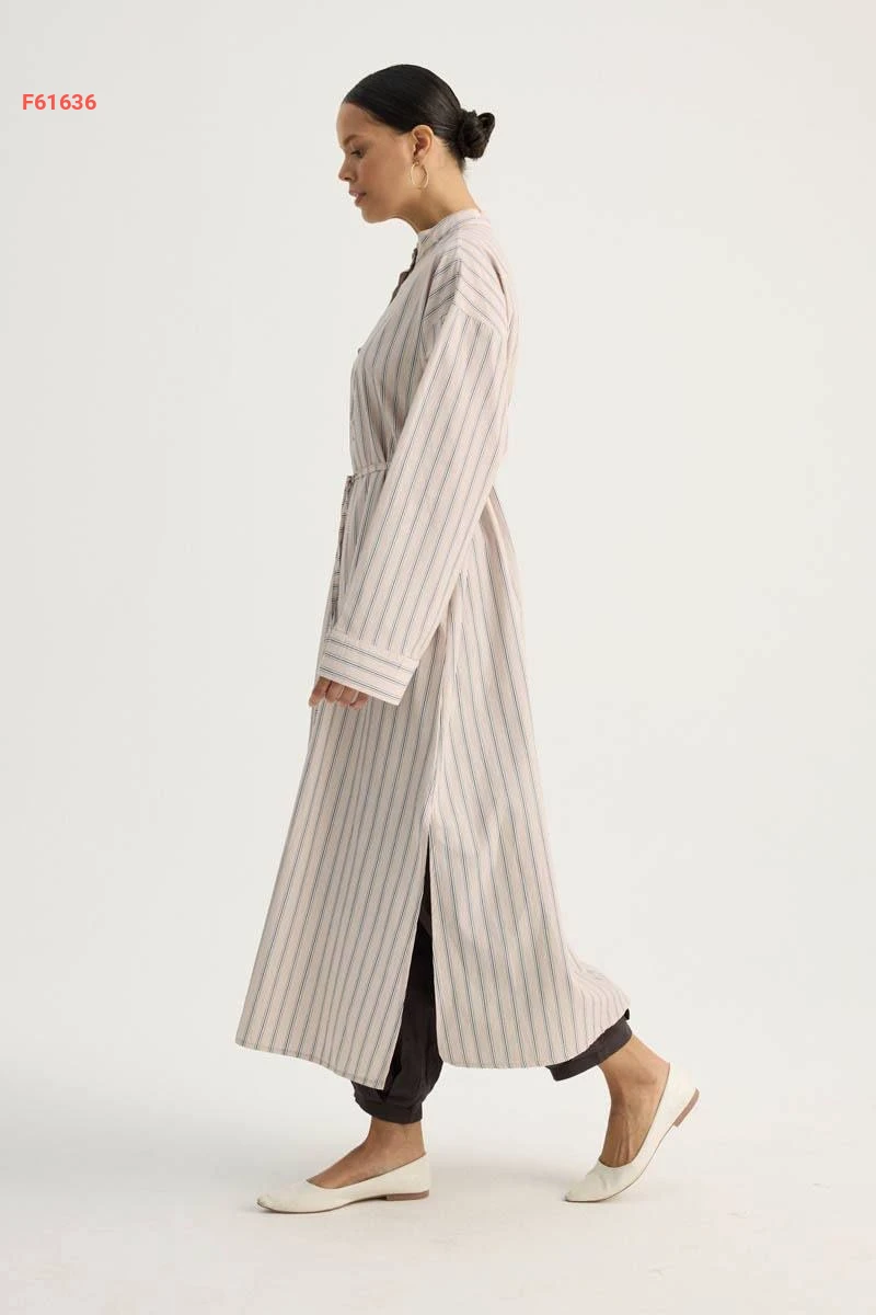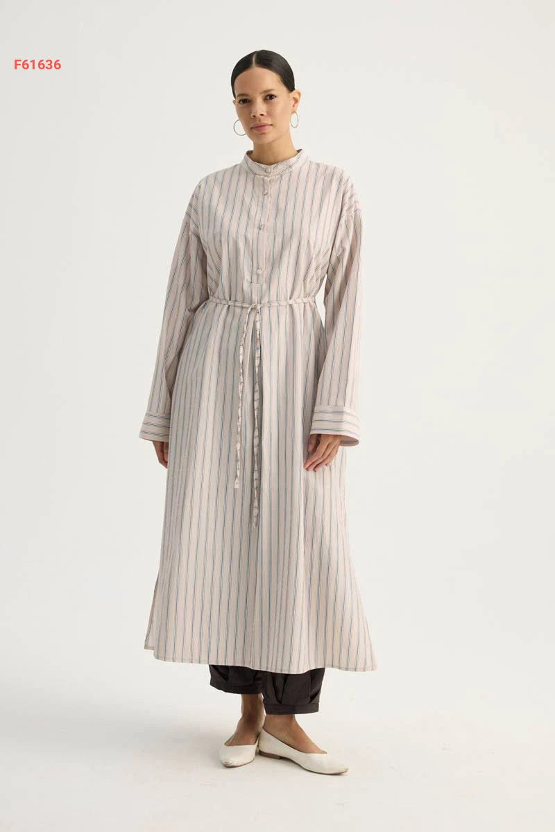 تونيك طويل مخطط بياقة دائرية بأزرار وربطة خصر
