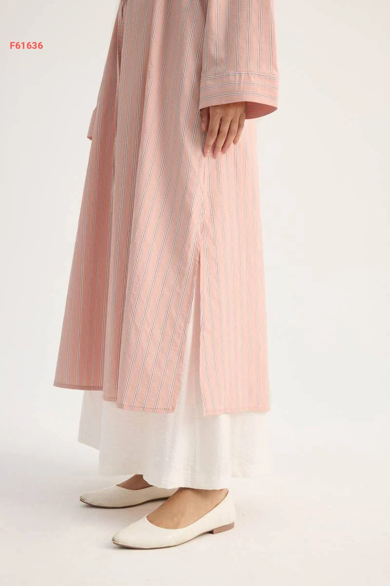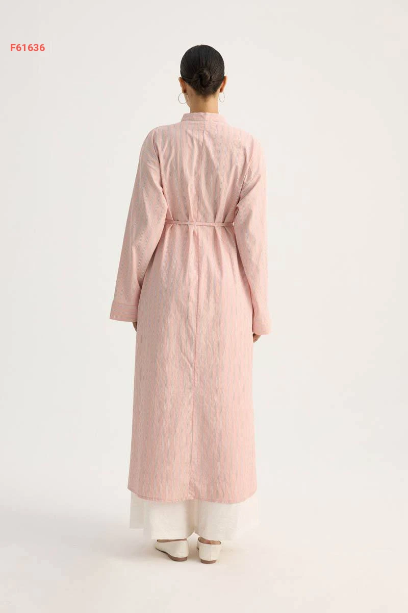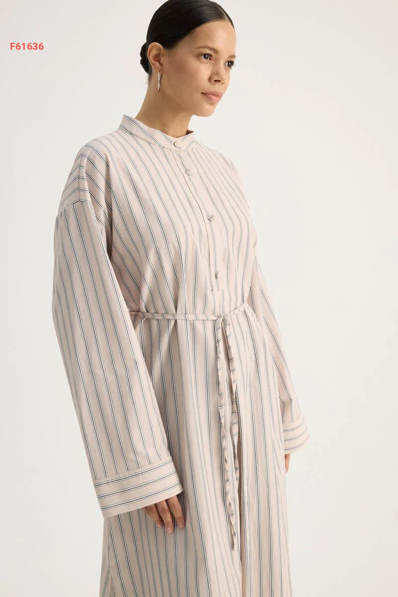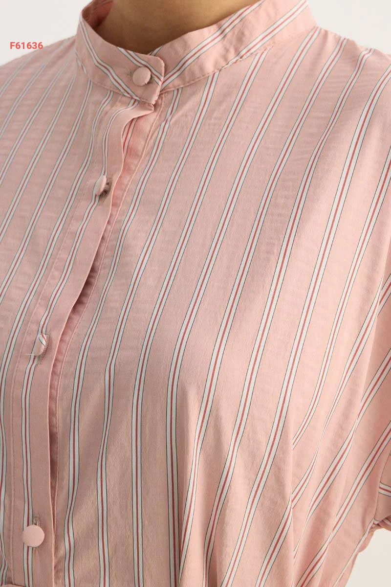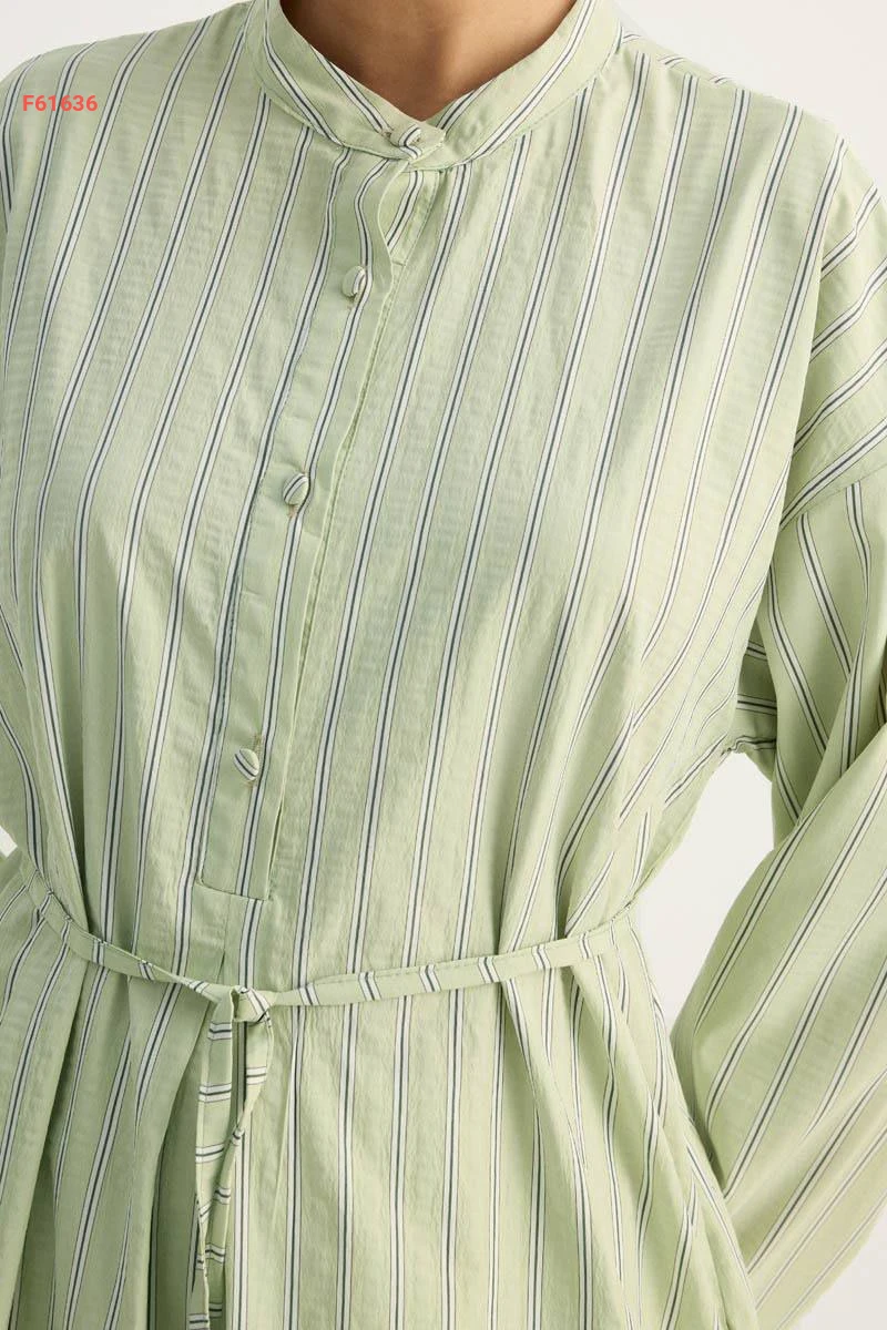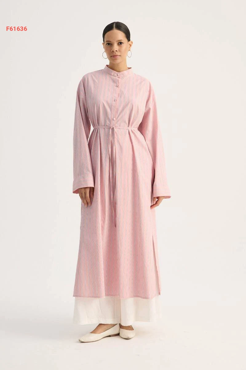 تونيك طويل مخطط بياقة دائرية بأزرار وربطة خصر