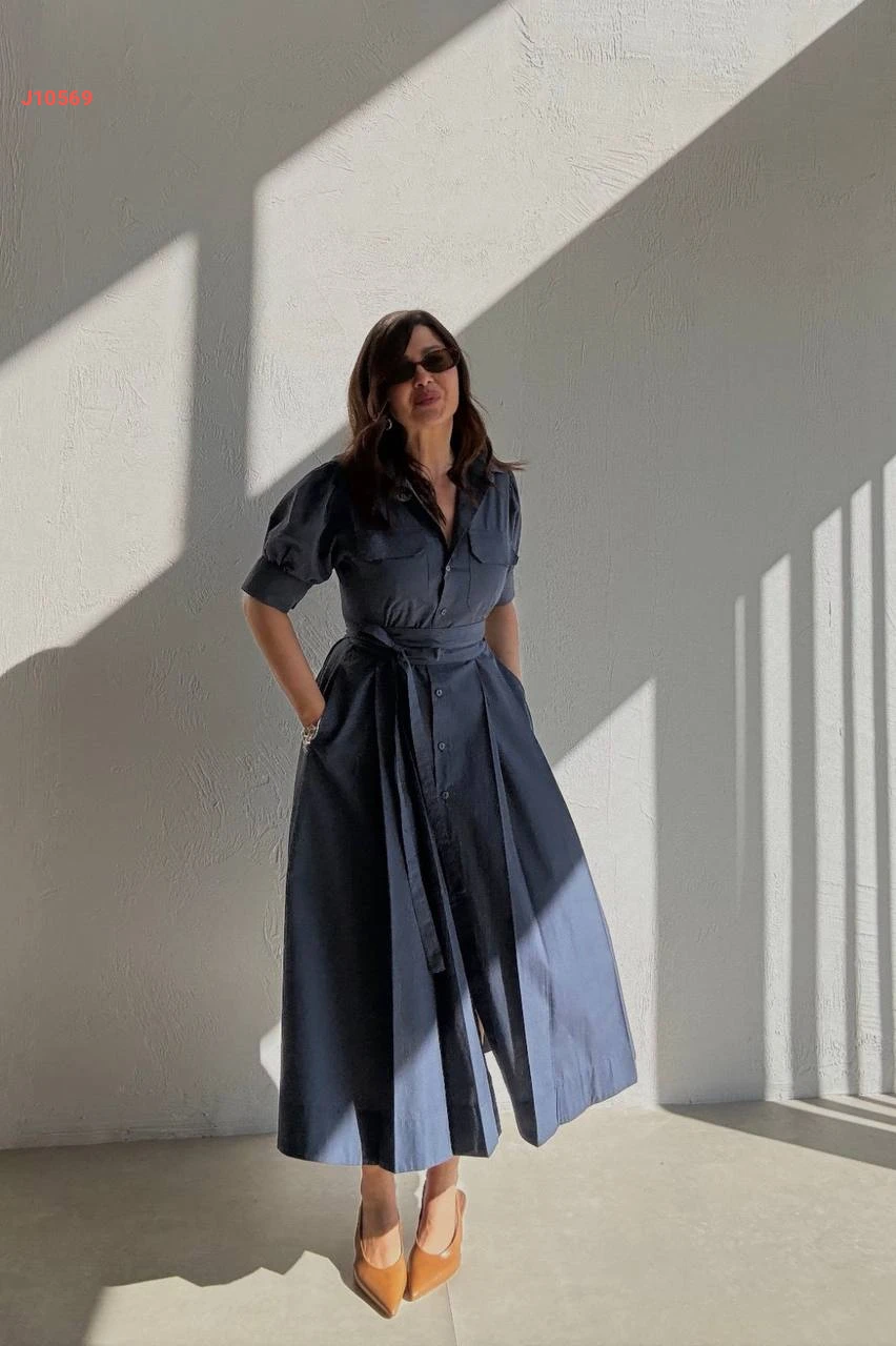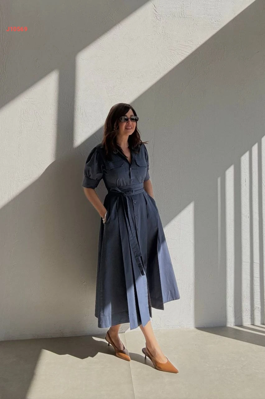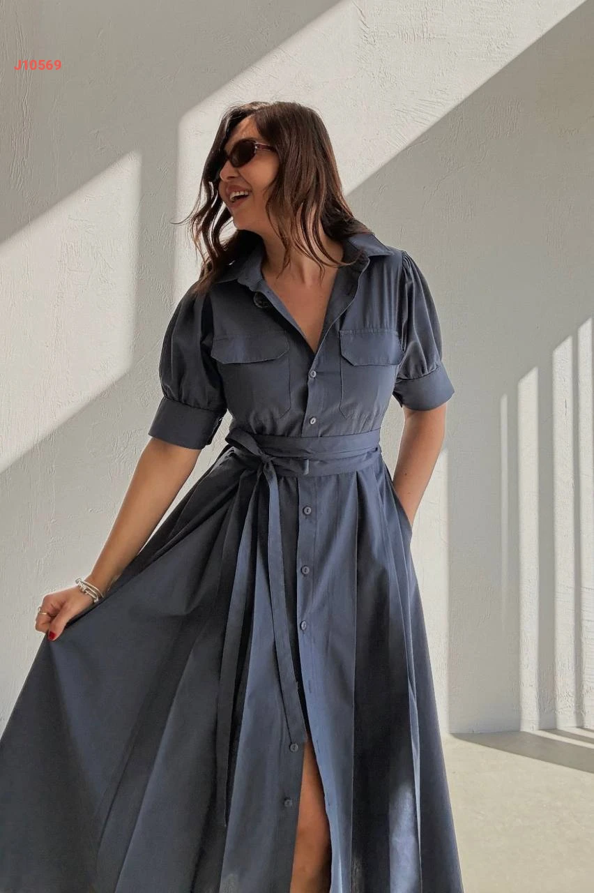 فستان صيفي طويل بأزرار وزنار