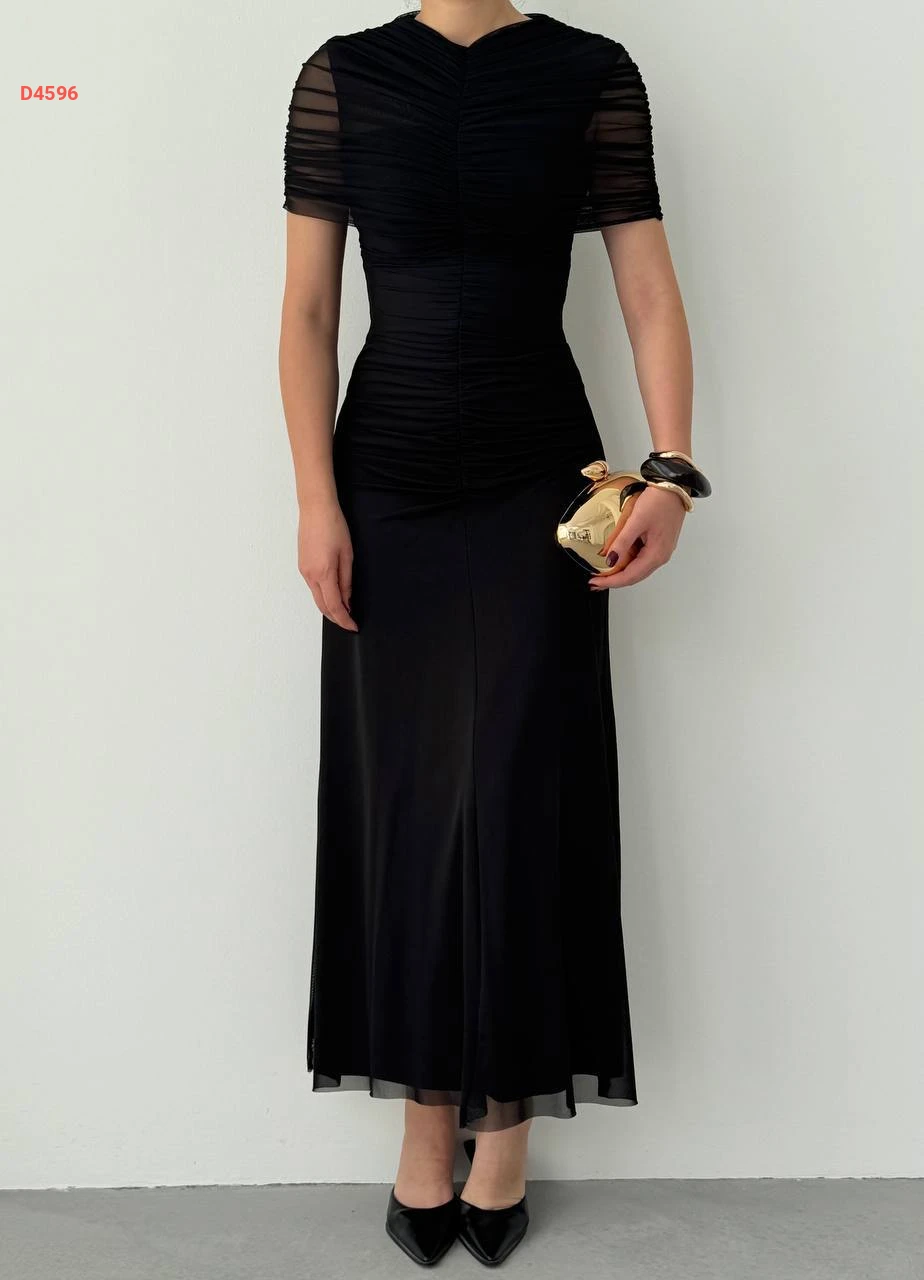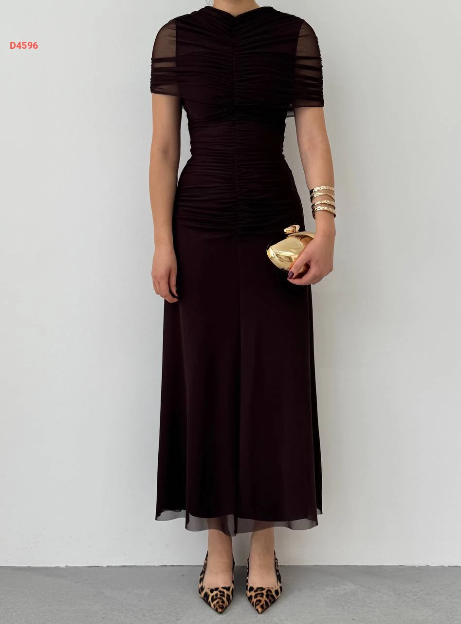 فستان طويل تول بتفاصيل مجمعة عالأكتاف