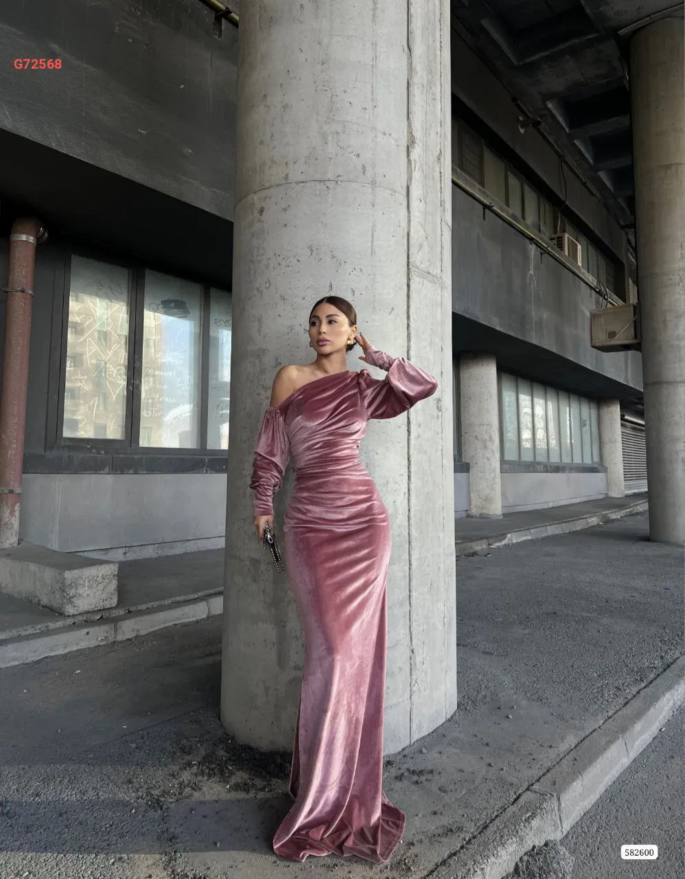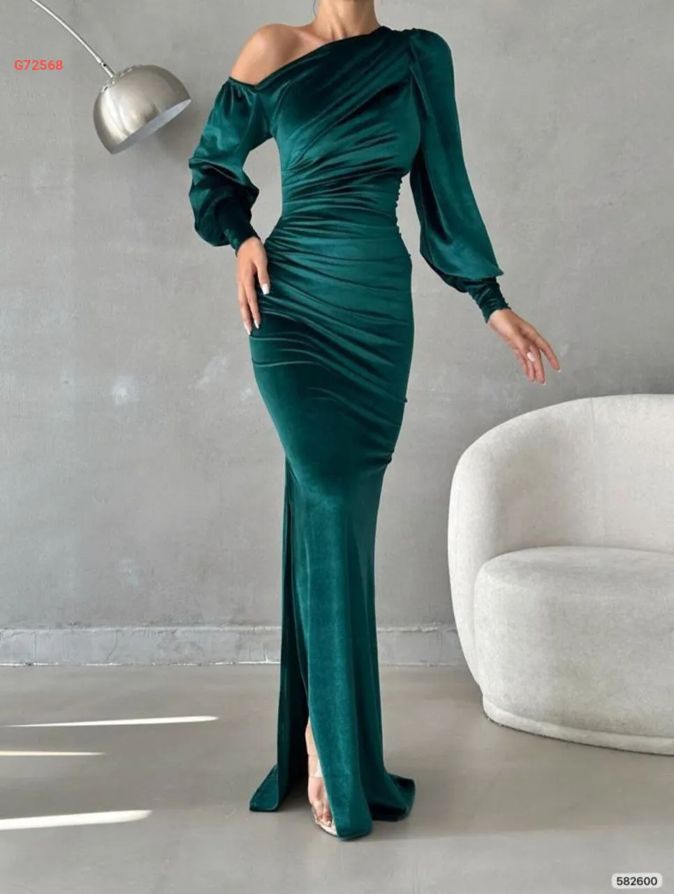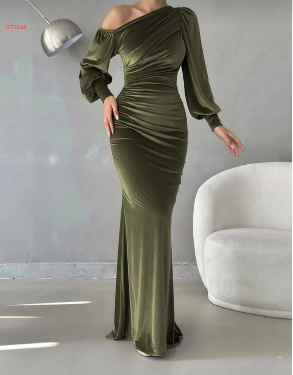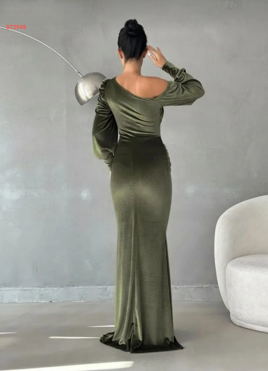فستان مخمل طويل مجمع بكتف منسدل