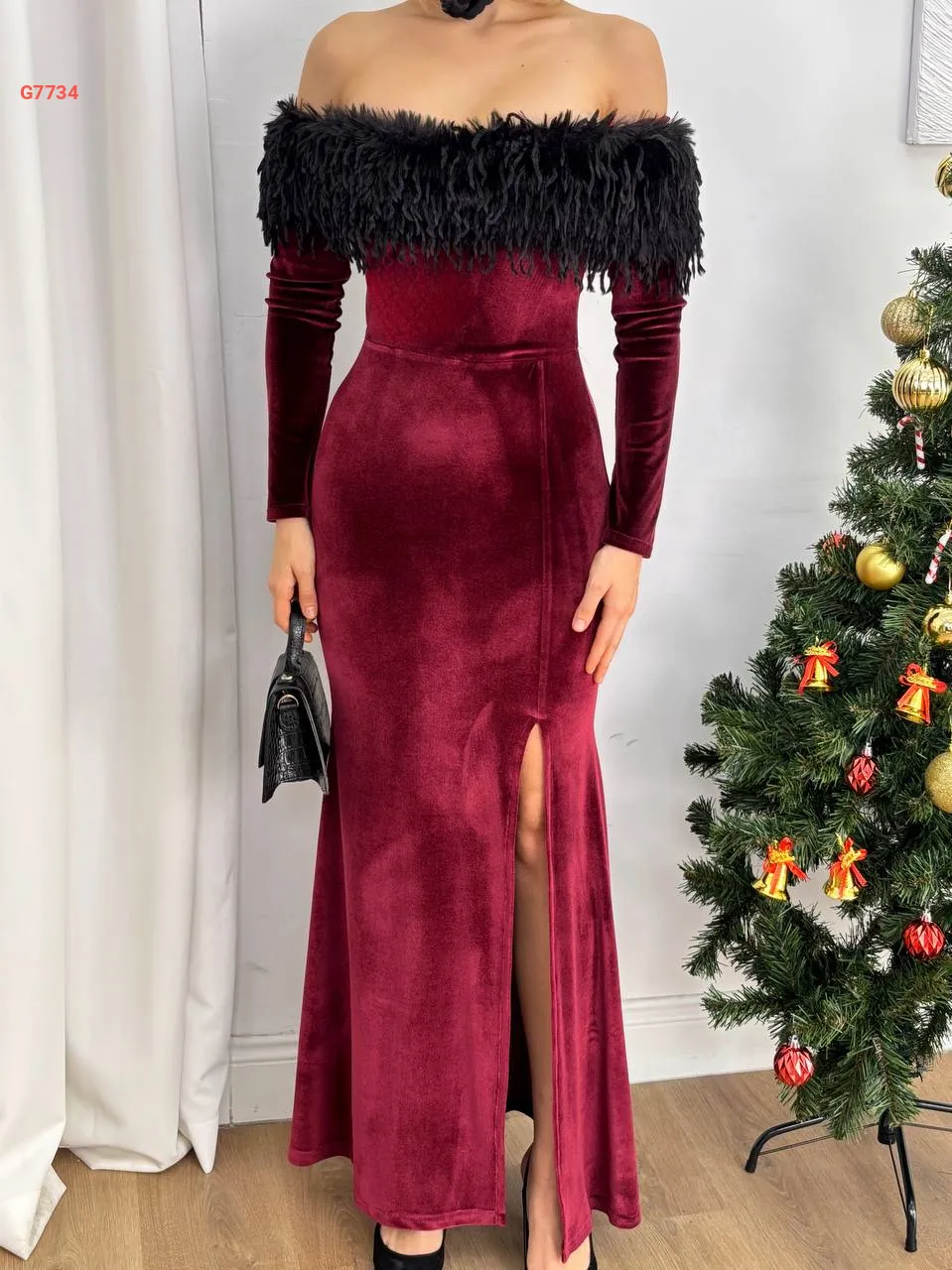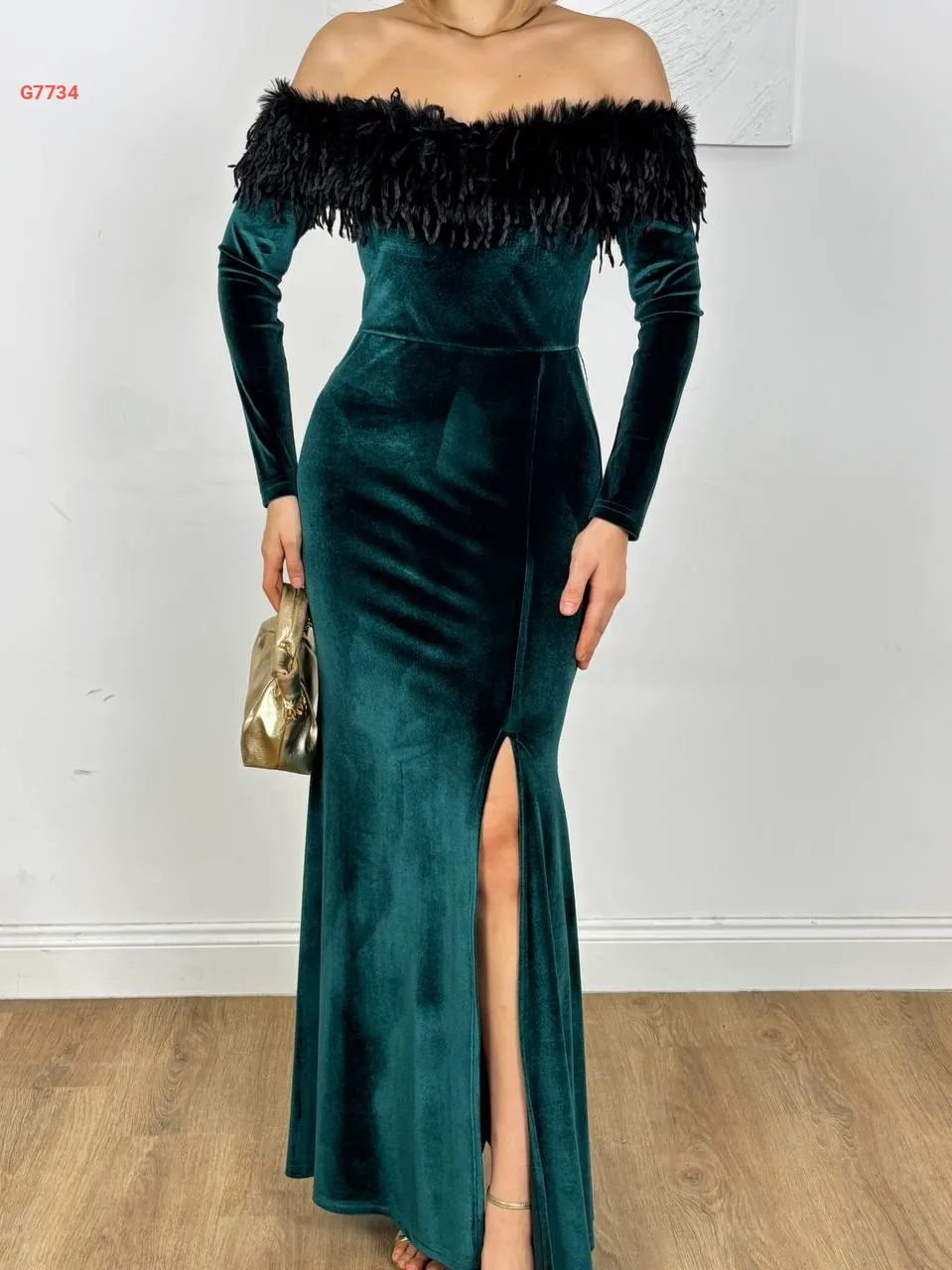 فستان مخمل طويل بياقة مادونا فرو