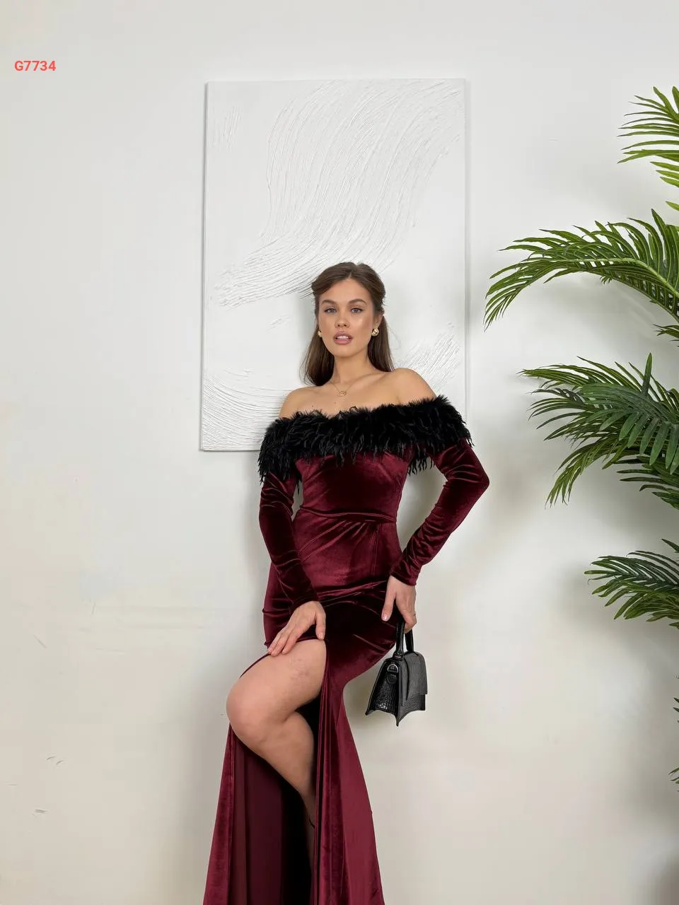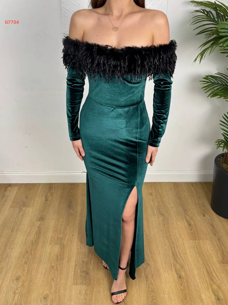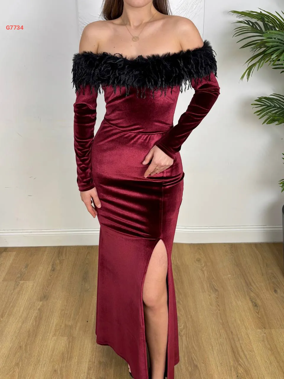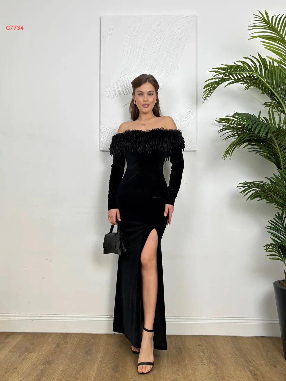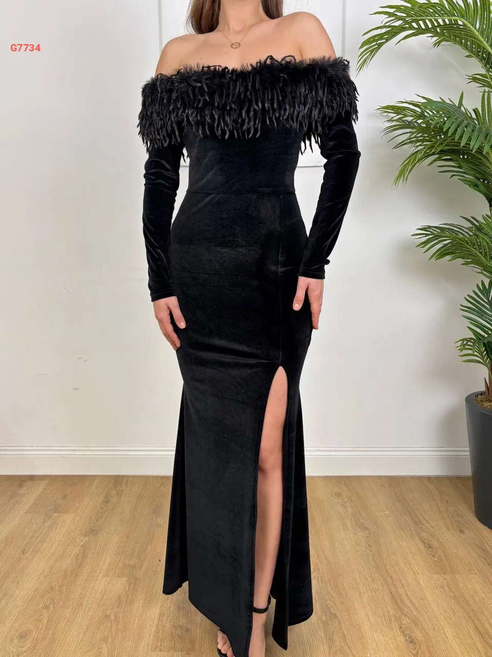 فستان طويل مخملي مع ريش وفتحة جانبية