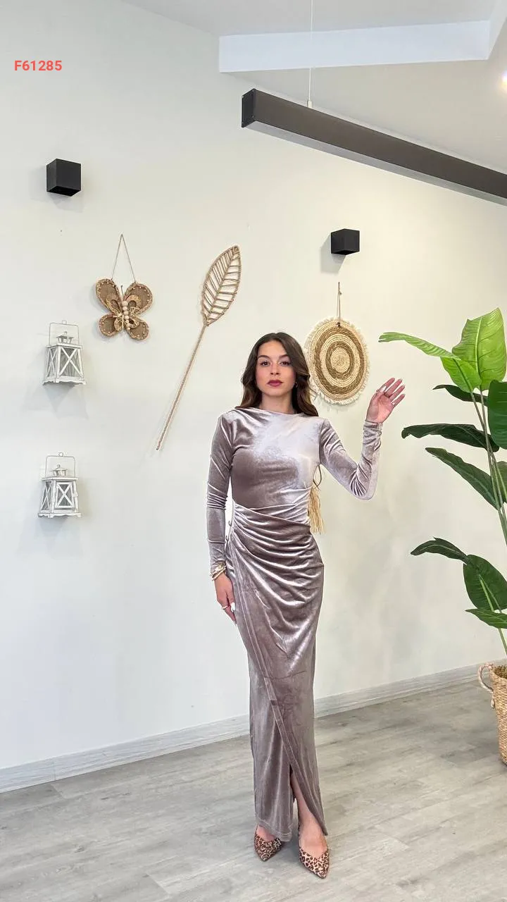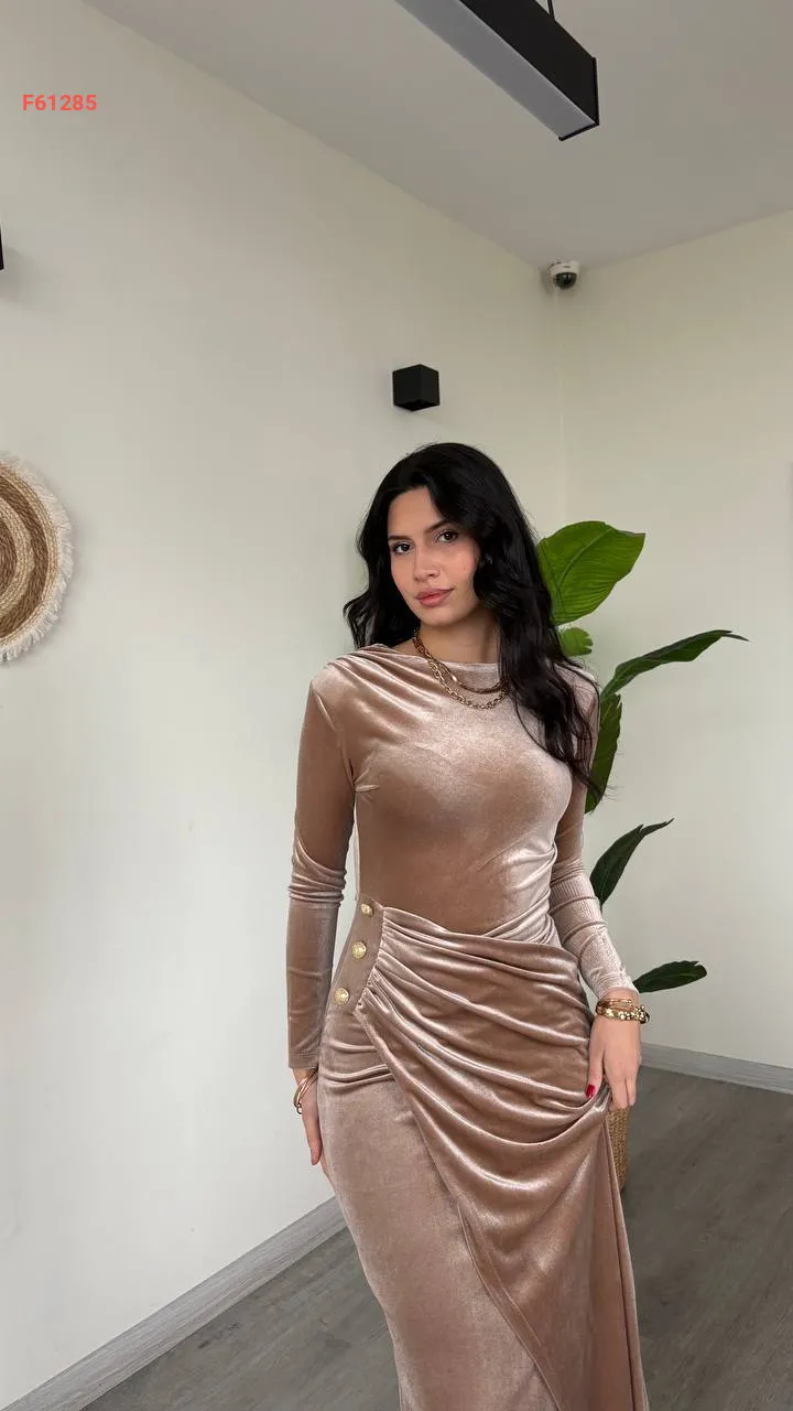 فستان مخمل طويل بأزرار جانبية عالخصر