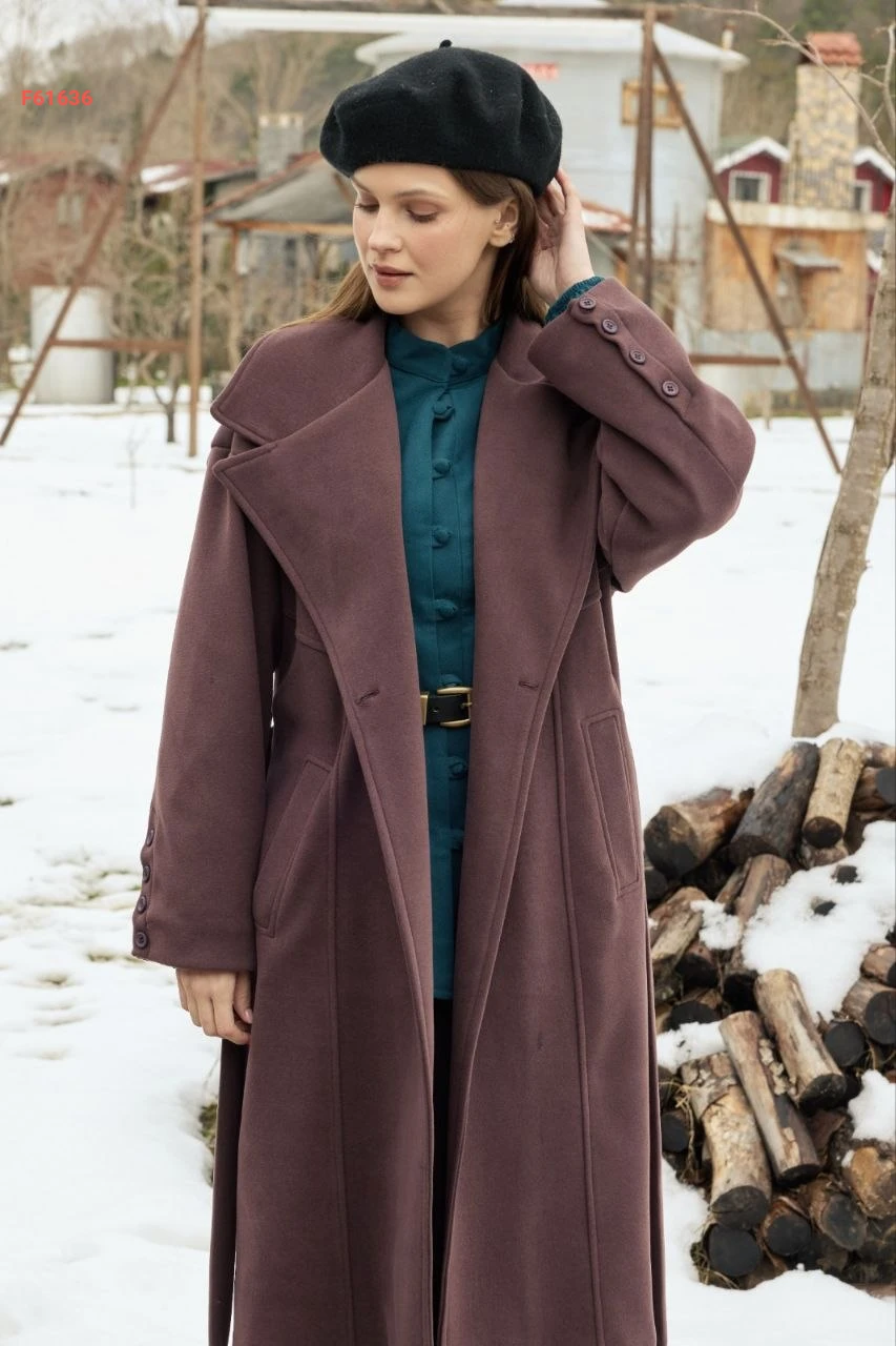 جاكيت جوخ طويل بأزرار مزدوجة مع حزام