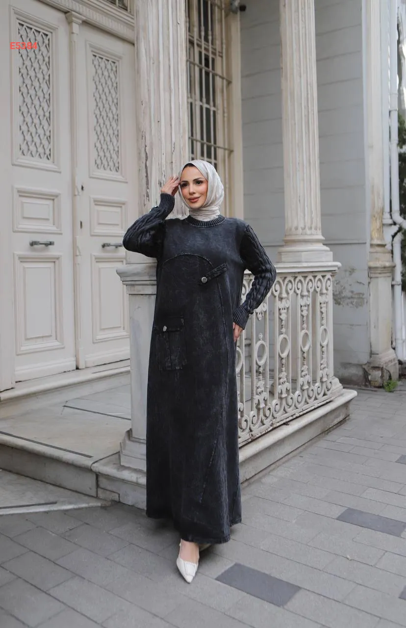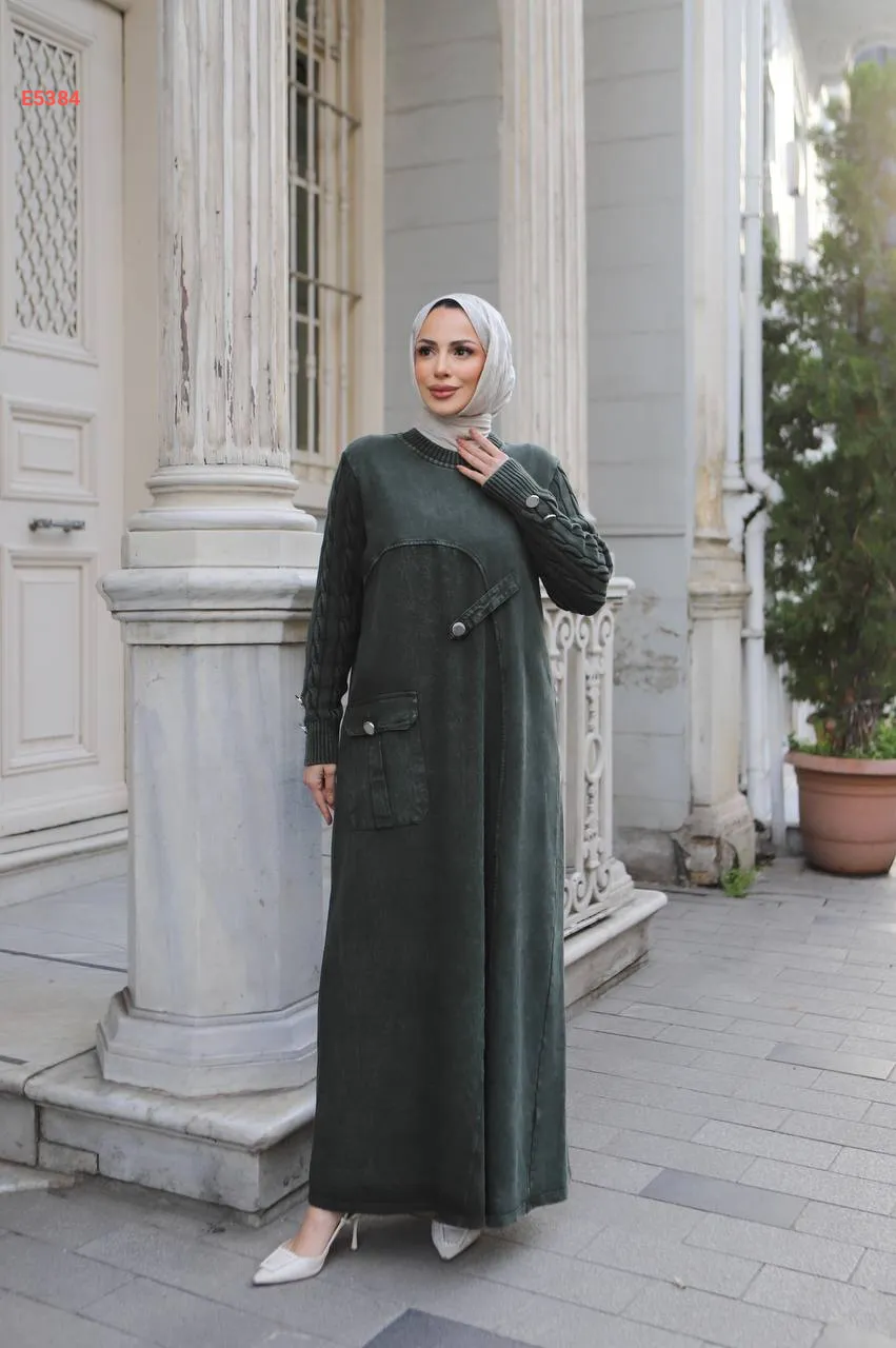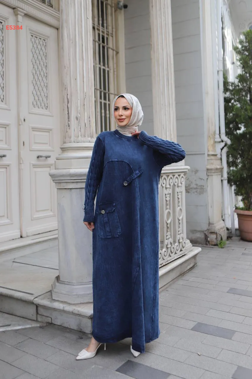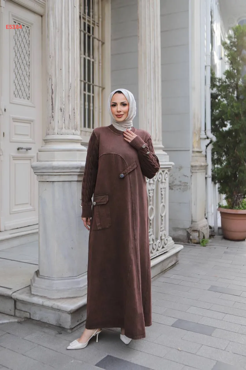 فستان واسع جيبة عريضة بالوسط بأكمام صوف متعدد الألوان