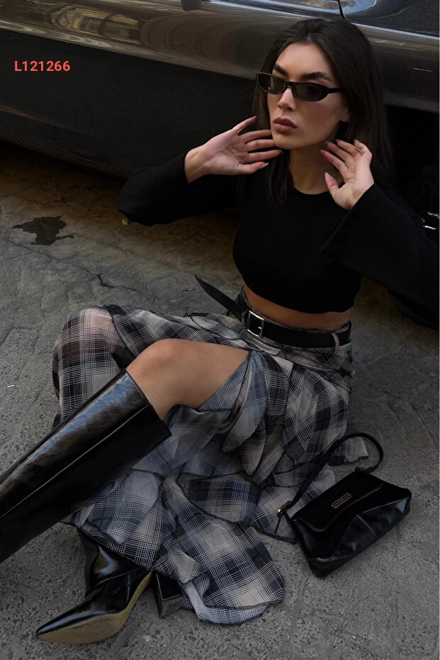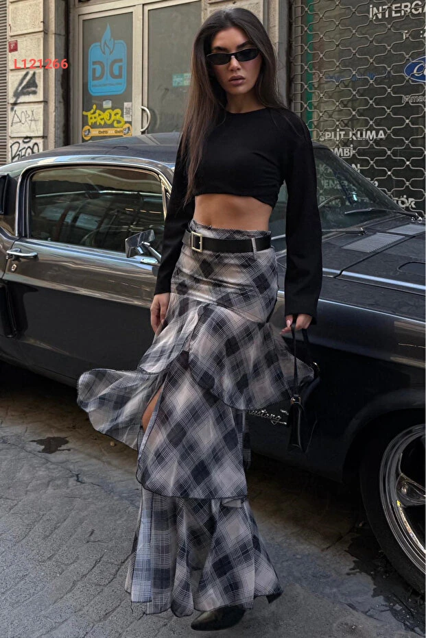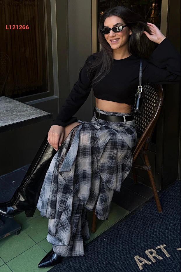تنورة مدمكس مزينة بكسرات وخطوط متقاطعة مع حزام أسود MG2715
