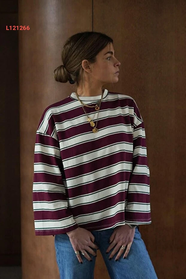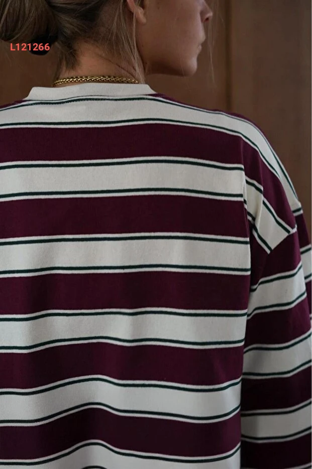 تي شيرت طويل الأكمام مخطط بوردو 100% قطن من مادماكس MG2362