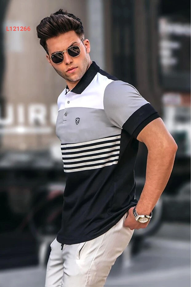 تيشيرت بولو طبقات مخطط للرجال باللون الأسود من ماديمكست 5865
