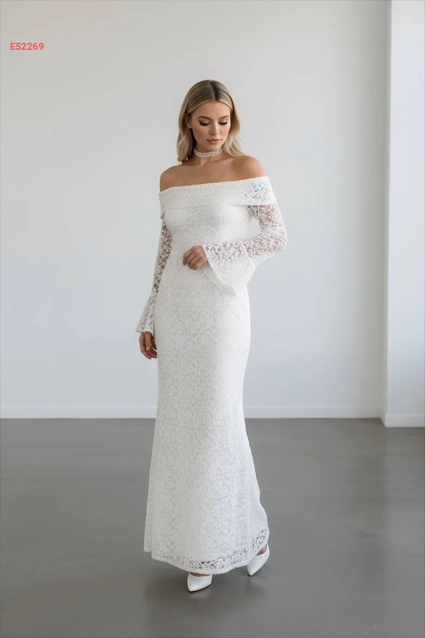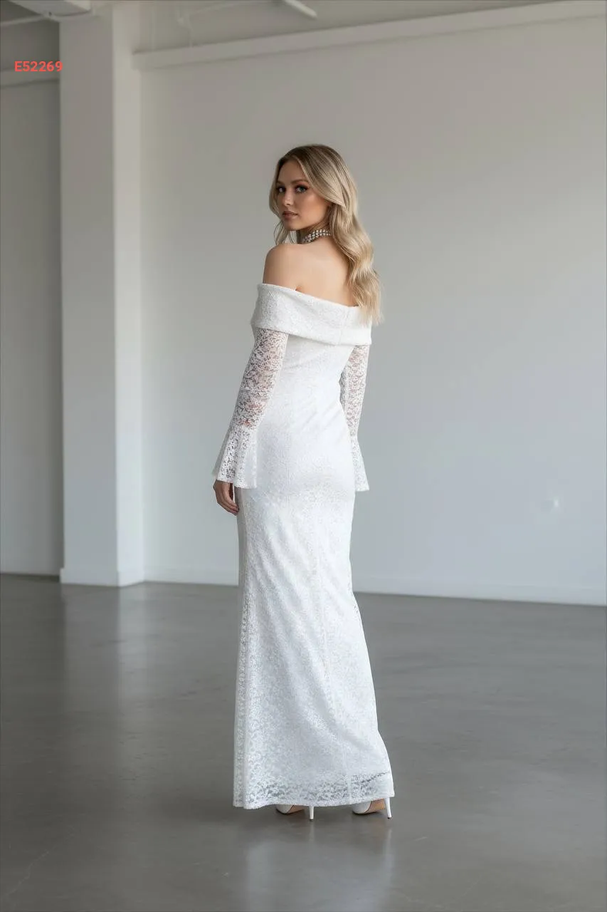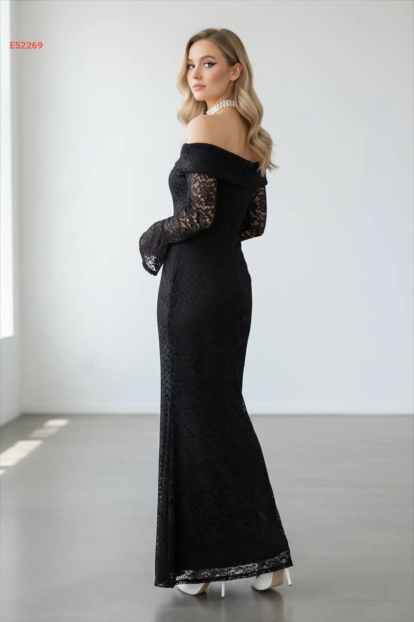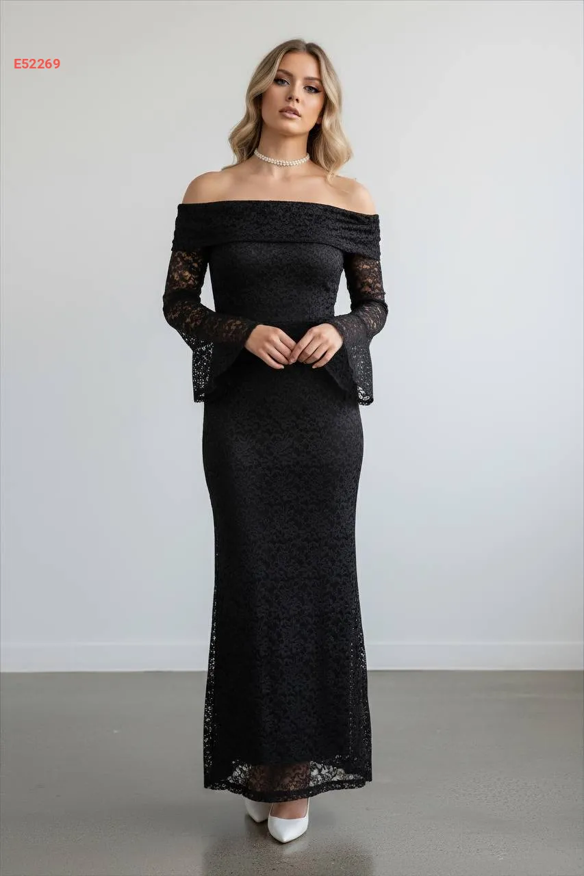 فستان دانتيل طويل بياقة مادونا