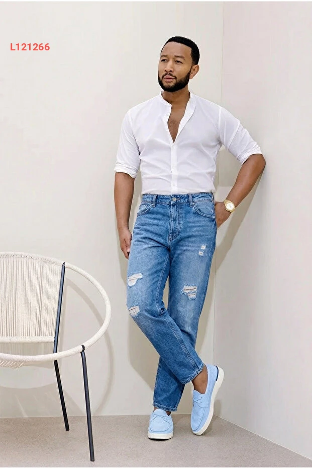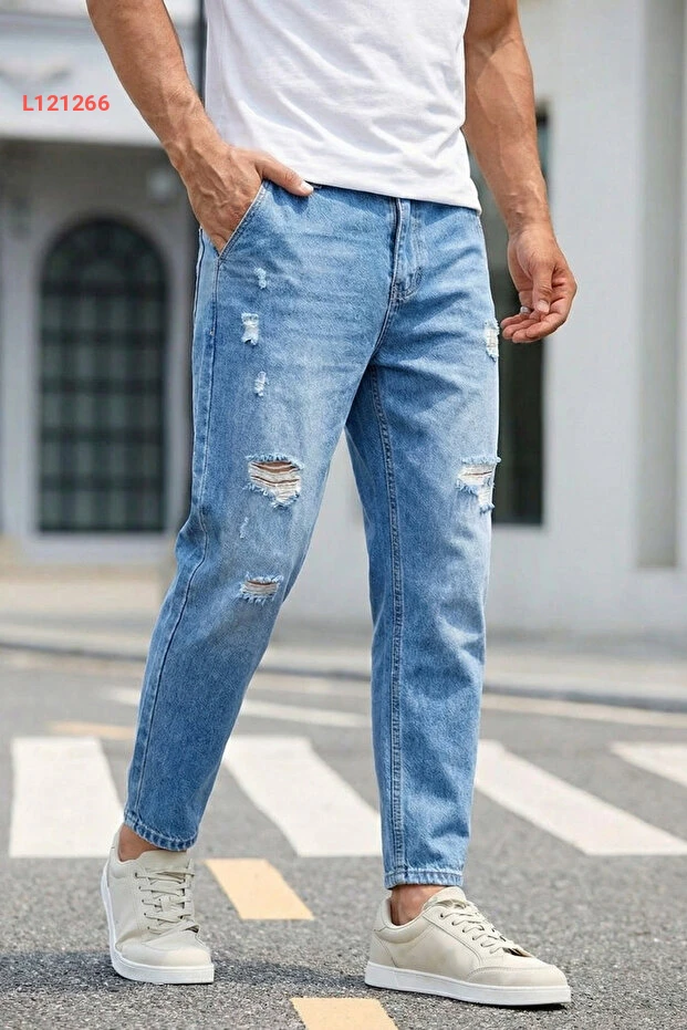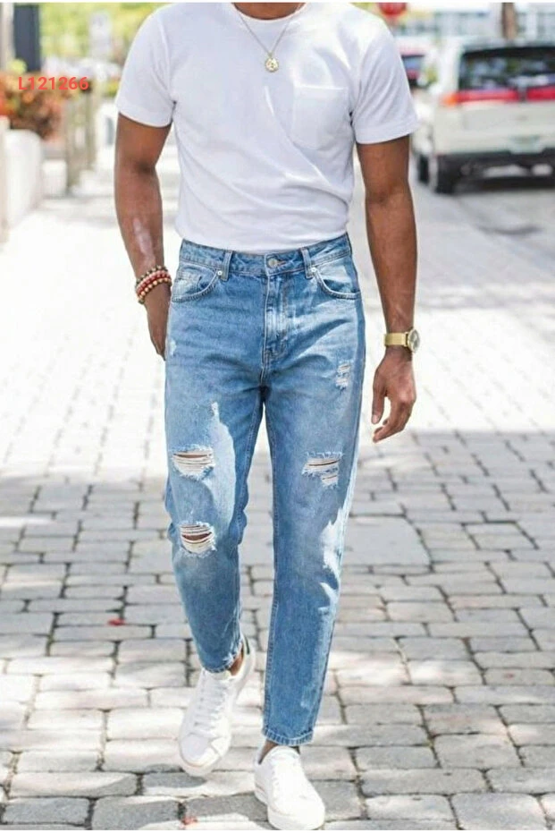 جينز دنيم أزرق بسحاب وقطع ممزقة من مادزي مودا للرجال