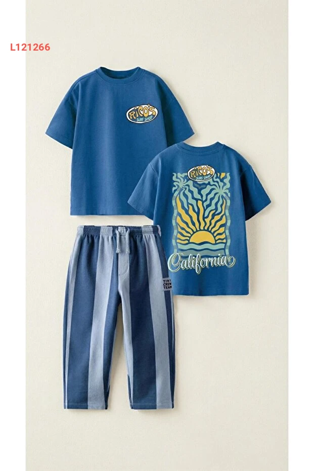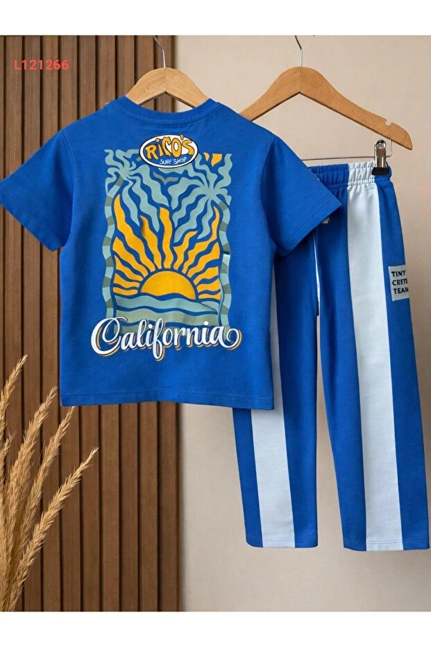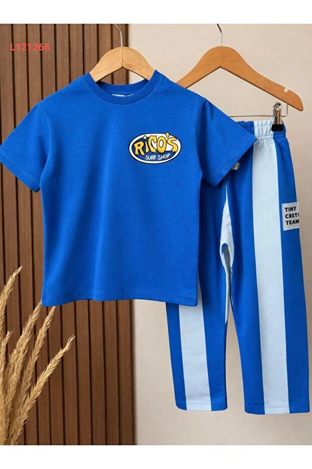 مجموعة تي شيرت وبنطلون مخطط للأطفال الصبيان - أزرق ملكي مصطنع من القطن