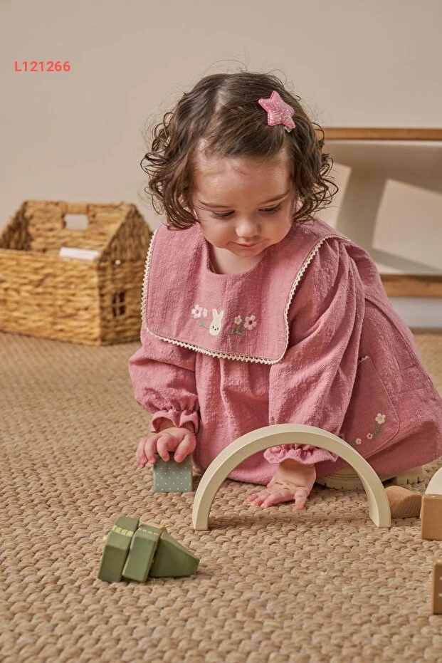 اختاري لأميراتك الصغيرة إطلالة ساحرة مع فستان "ماغو" المصنوع من القطن الناعم بلون رقيق من الورد. يتميز الفستان بأكمام طويلة ولائحة جيوب عملية، بالإضافة إلى تطريز رقيق لشكل الأرنب، مما يضمن راحة وأناقة لا مثيل لها في كل مناسباتهن. مثالي لأيام اللعب أو المناسبات السعيدة!