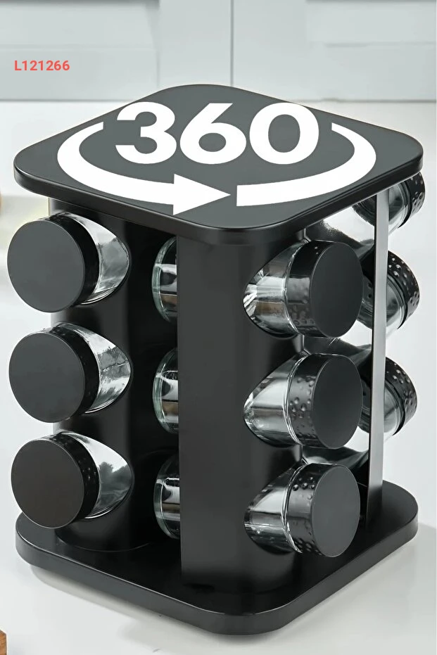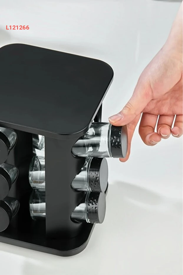 طقم بهارات زجاجي دوار مع Stand من الفولاذ المقاوم للصدأ - 12 قطعة باللون الأسود مربع