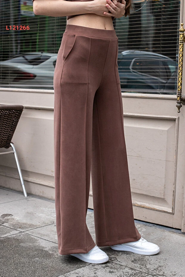 بنطلون بالازو فضفاض بخامة مودال سميكة ومرنة بخصر عالي وجيوب - بني