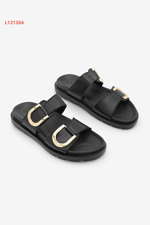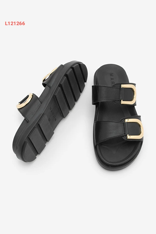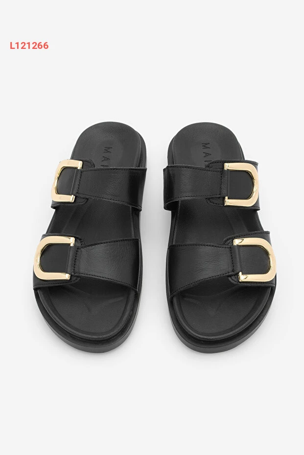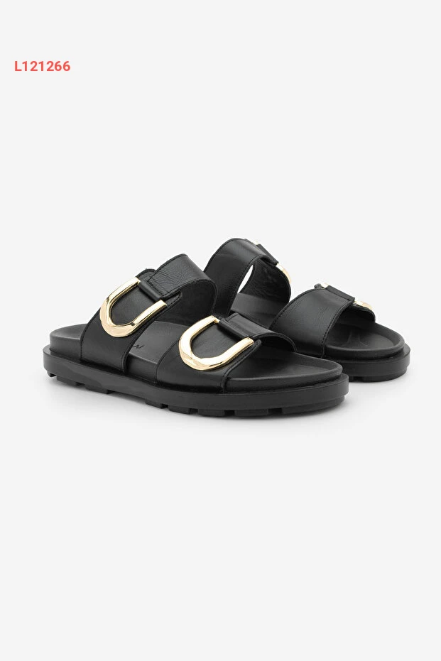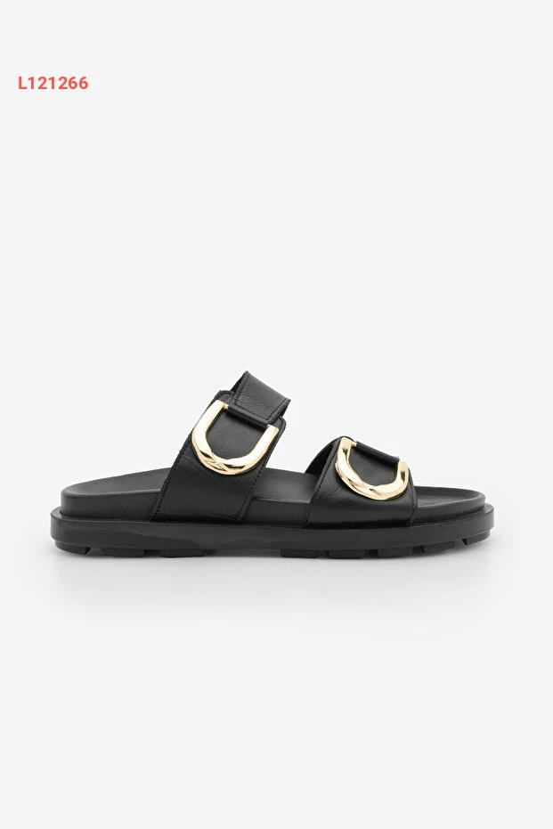 صندل مرpe النسائي من الجلد الطبيعي بتفاصيل مشبك ذهبي وقاعدة سميكة - أسود