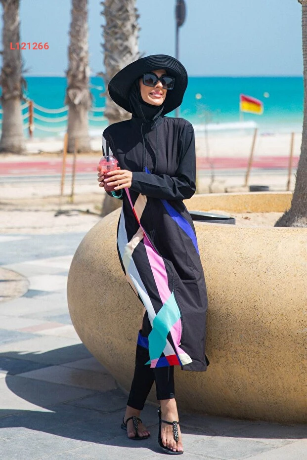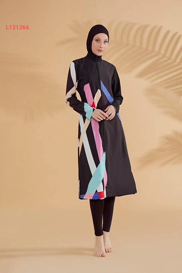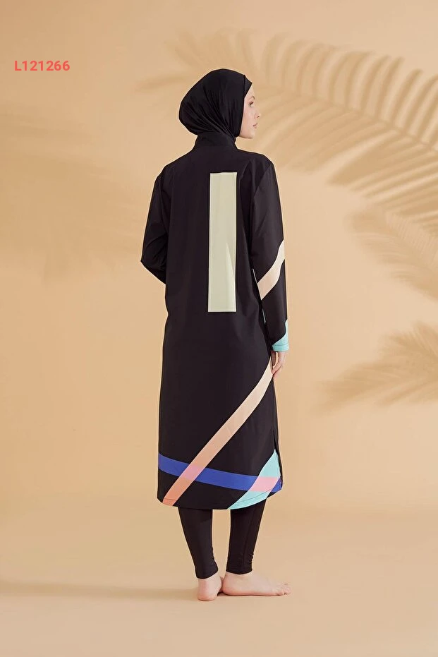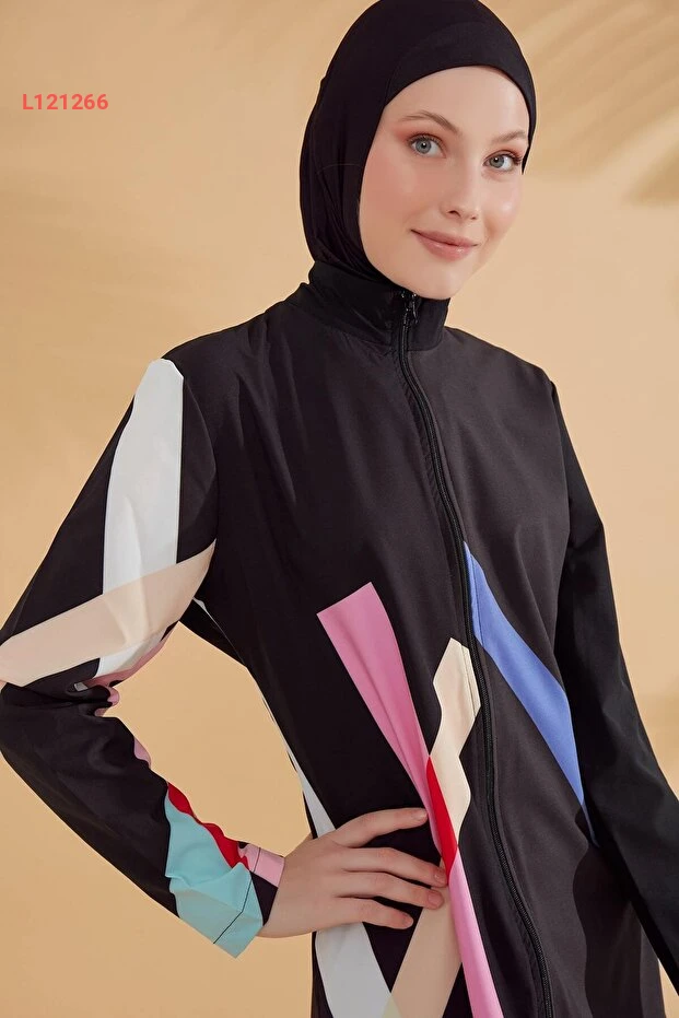 استمتع بالراحة والأناقة مع مايو مارينا بملابس السباحة المغلقة بالكامل. يتميز بتصميمه الهندسي الجذاب ولونه الأسود الأنيق، مما يمنحك إطلالة متطورة وتحافظ على احتشامك في آن واحد. مصنوع من أقمشة عالية الجودة تضمن لك حرية الحركة وتجفيف سريع، مثالي ليومك على البحر أو المسبح.