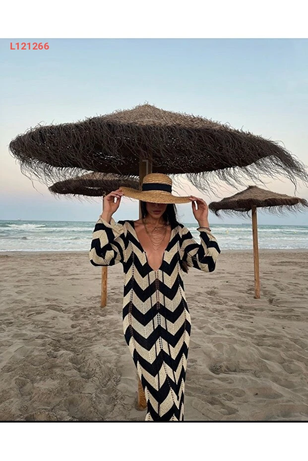 فستان ساحلي ماكسي مزخرف بخطوط مائلة بياقة على شكل V