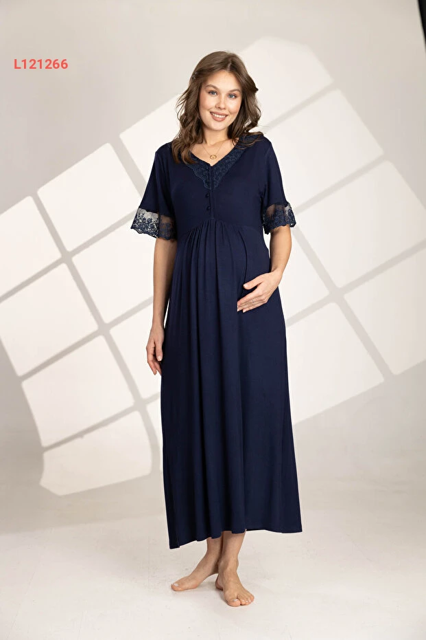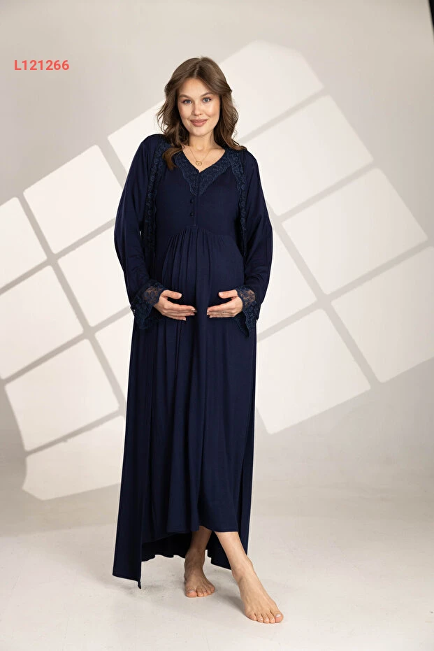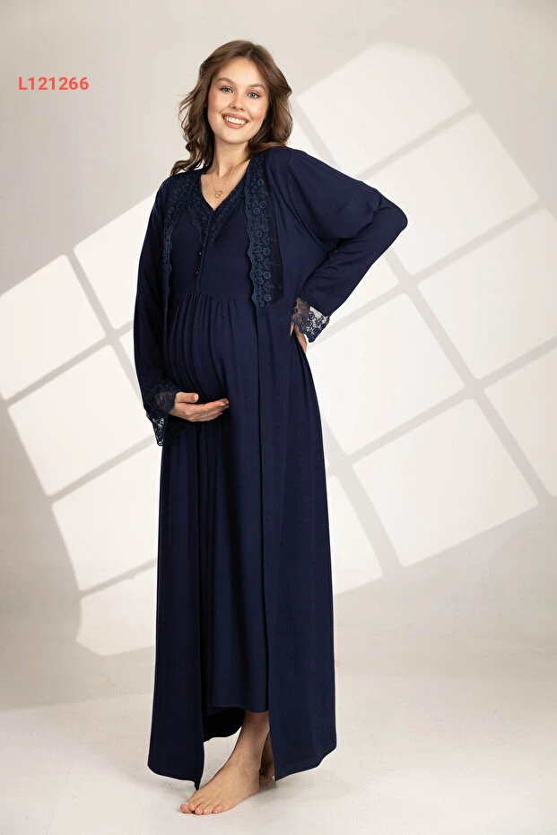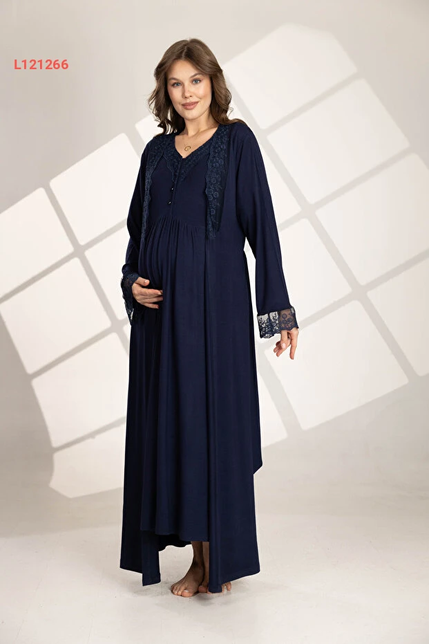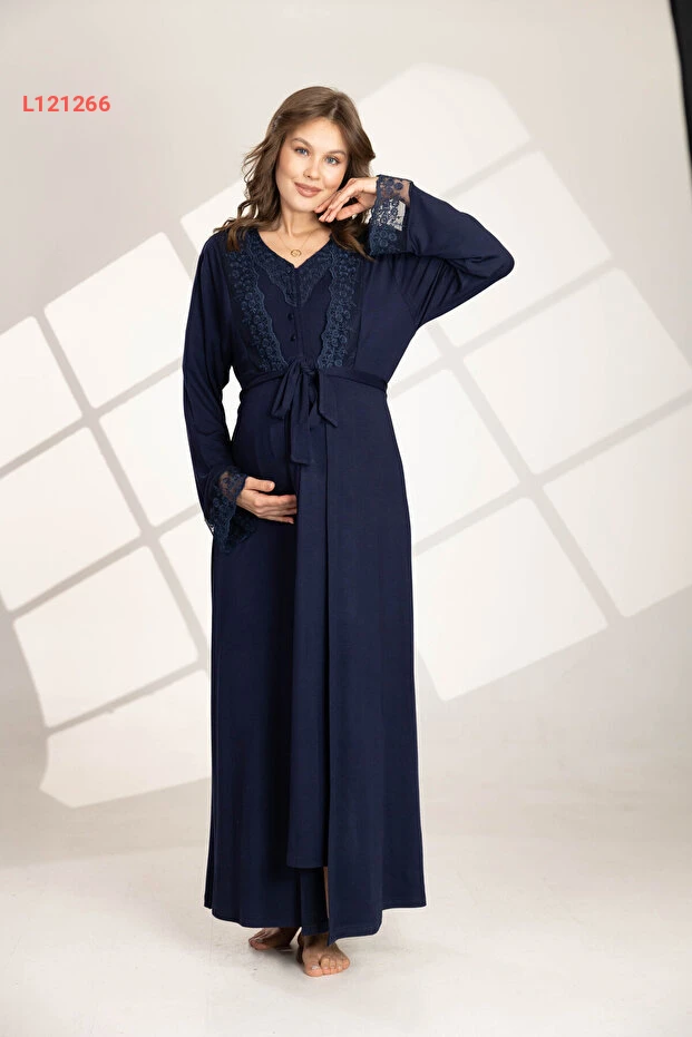 طقم ليلية ما بعد الولادة مع روب طويل مزين بالدانتيل باللون الأزرق الداكن