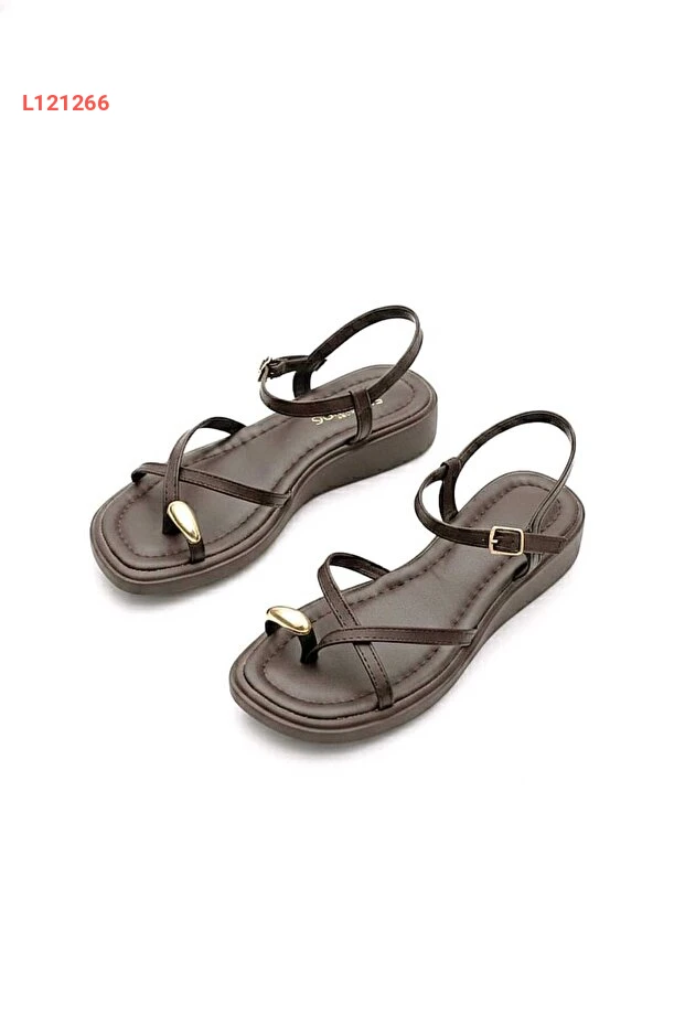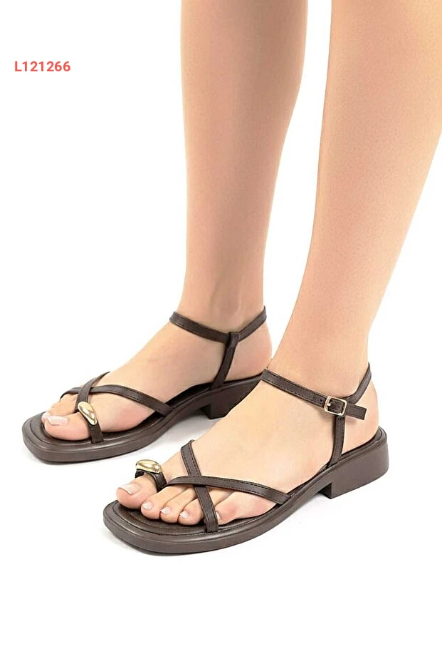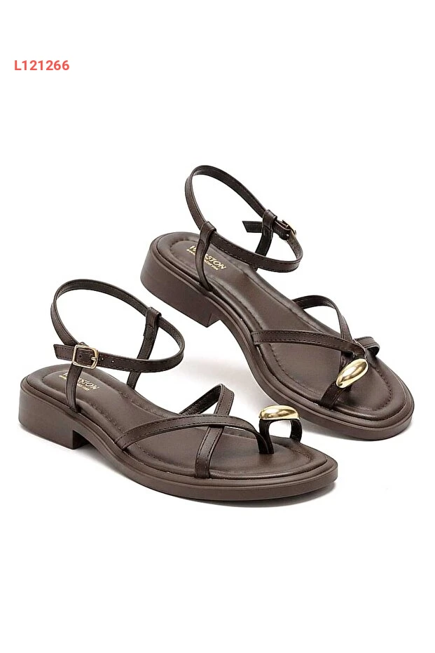صندل عريض بكعب لامع للنساء بتصميم جذاب بلون بني داكن