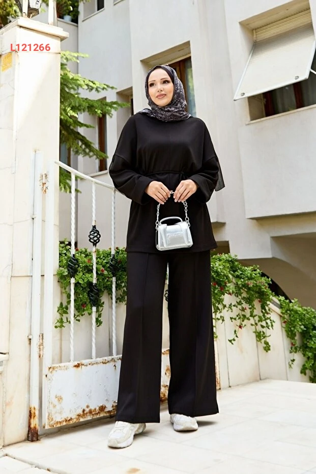 استمتعي بالأناقة والراحة مع طقم "Meba" للتسوق النسائي، المصنوع من قماش المودال الفاخر الذي يمنحك نعومة لا مثيل لها. يتميز التصميم برباطات تفصيلية جميلة، بالإضافة إلى ياقة دائرية جذابة، مما يجعله خيارًا مثاليًا لمظهر عصري ومتجدد في كل مناسبة. ارتدي الثقة والراحة مع هذا الطقم الأسود الأنيق الذي يتماشى مع كافة أزيائك.