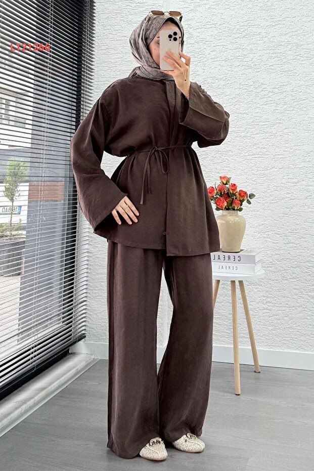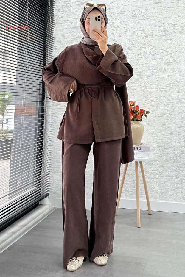 طقم ميليك أراز النسائي المكون من قطعتين مع حزام - بني