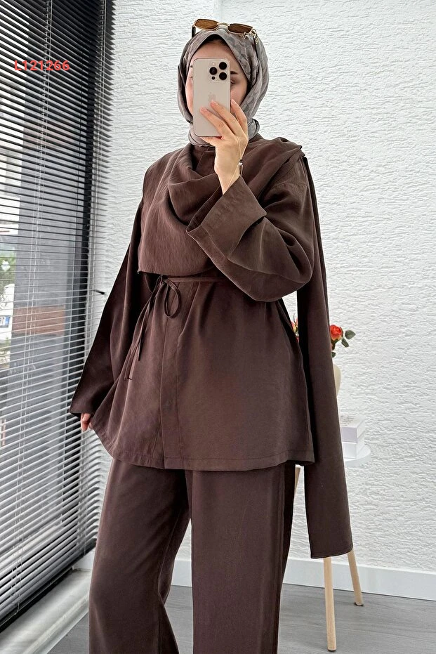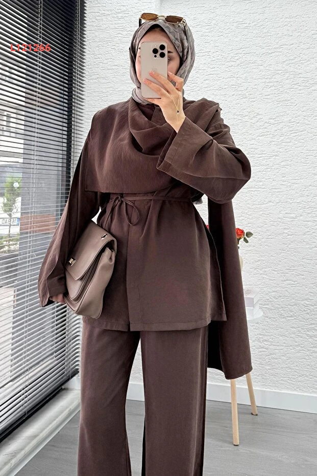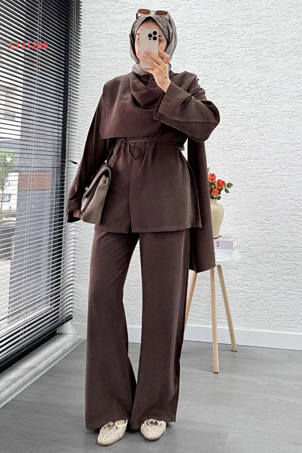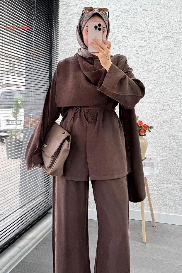 استمتعي بالأناقة والراحة مع طقم MELEK ARAZ المميز الذي يجمع بين التصميم العصري واللمسات الكلاسيكية. يتكون من سترة رائعة وتنورة كيمونو مزودة بحزام، مما يتيح لكِ تنسيق إطلالة مثالية لكل المناسبات. يأتي بلون بني دافئ يضفي لمسة من الأناقة على خزانة ملابسك ويضمن لكِ الراحة طوال اليوم.